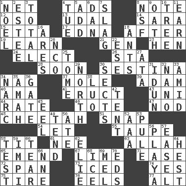 ACROSS 1. Fish or hair follower 4. Bits 8. Observe 12. Bear (Spanish) 13. Hereditary estate 14. "Two Mules for Sister ____" 15. Singer James 17. Pulitzer Prize-winning author Ferber 18. Following 19. Acquire or gain knowledge or skills 21. Commissioned mil. rank 23. Layer 24. Voters do this 26. R.R. building 28. Within a short period 30. French poetic form 34. Tired old horse 37. Undercover agent 39. First man 40. Housemaid (var.) 41. Spew [out] 43. Single; one (prefix) 44. Pace 46. Haul 47. Dreamland 48. Leopard's kin 51. Fastener 54. Allow 55. Grayish beige 58. Teat (slang) 61. Born 63. Assad's deity 65. Make improvements or corrections to 67. Welles in "The Third Man" 71. Relaxation 72. Connect, as a bridge 73. On the rocks 74. It is so 75. Become fatigued 76. Snakelike fish 77. Keyboard modifier key DOWN 1. Christmas carol 2. First name in cosmetics 3. Add up to 4. Third day of the wk. 5. Find the sum of 6. Daniel's nick name 7. Volcanic refuse 8. Science/research agcy. 9. Pledge 10. Relationship diagram 11. Merit 16. Ancient Greek god of war 18. Pismires 20. Non-commissioned officer (abbr.) 22. Compass dir. 25. Heavy book 27. "One Day ___ Time" 29. 0 degrees 30. Religious groups 31. Goddess of spring and wife of Bragi 32. Billionth: prefix 33. Among 34. Drug cop 35. Nanny 36. Yard entry 38. Nilotic language 42. Portable shelter 45. Snakelike fish 49. Look after 50. Had dinner 52. Auto club (abbr.) 53. Whimper 56. Beach, in Buenos Aires 57. Artist's stand 58. Trial 59. Body of Kaffir warriors 60. Lacerate 62. Writer Wiesel 64. Command 66. Compass dir. 68. Frozen water 69. Cartoonist voice _ Blanc 70. Begley and Asner