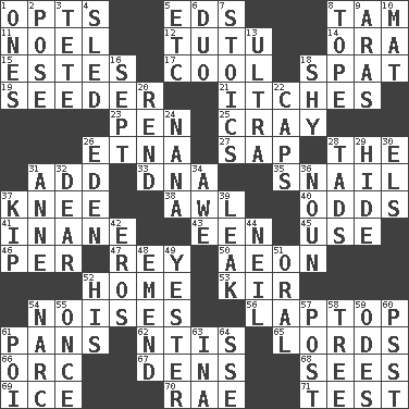 ACROSS 1. Chooses 5. Begley and Asner 8. Scottish cap 11. Christmas carol 12. Ballerina skirt 14. Mouth or opening 15. _____ Park, CO 17. Calm and collected 18. Argument over a trivial matter 19. Sowing specialist 21. Irritating cutaneous sensations 23. Fenced enclosure 25. Supercomputer manufacturer 26. Inactive volcano in Sicily 27. Plant excrement 28. Definite Article 31. Find the sum of 33. Heredity factor (abbr.) 35. Slow-paced one 37. Leg joint 38. Leather borer 40. Probability 41. Silly 43. Car or cant ending 45. Purpose 46. For each 47. Marina Del _, California 50. Age 52. Dwelling 53. Apertif with cassis 54. Annoying sounds 56. Portable computer 61. Baking dishes 62. Nuclear Threat Initiatives 65. Nobles 66. The grampus (Milton) 67. Habitations of wild animals 68. Observes 69. Frozen water 70. Actress Charlotte 71. Trial DOWN 1. Singles 2. Introduce or present, as a question 3. False hair 4. Downhill vehicle 5. And so on (abbr.) 6. Superhero pair 7. Unemotional ones 8. Drink excessively 9. Caspian sea tributary 10. Floor protector 13. Extreme 16. Back-to-school mo. 18. Like a shrinking violet 20. Tear apart 22. Smile enhancers 24. Nanny 26. Paradise 28. Bits 29. Flintstone garb 30. Raised railways 31. Queen of England 1702-14 32. Letter starter 34. Deep reverence 36. Part of speech 37. Sleep 39. Path through which fluid escapes 42. Greek god of love 44. Famous astronaut Armstrong 48. Make improvements or corrections to 49. Last past 51. Taken by mouth 52. Part of HMS, perhaps 54. Drug cop 55. Single time 57. Mail 58. Family _ (genealogy) 59. Lyric poems 60. Inconspicuous attention getter 61. Luau course 63. _ tizzy (2 wds.) 64. Compass dir.