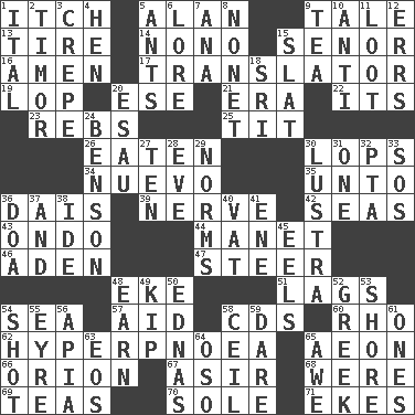 ACROSS 1. Hankering 5. ____ Jay Lerner 9. Lie 13. Hoop that covers a wheel 14. Words to Nanette 15. Sir (Sp.) 16. So be it 17. Interpreter 19. Trim (branches) 20. Compass dir. 21. Period 22. ___ a Wonderful Life 23. Confederate soldiers (slang) 25. Teat (slang) 26. Eroded 30. Chops off 34. New (sp.) 35. To (old English) 36. Raised platform 39. Boldness 42. Oceans 43. Southwest Nigerian state 44. French painter Edouard 46. Arabian gulf 47. Bull 48. Make supply last 51. Straggles 54. Ocean 57. Help 58. Music discs 60. 17th letter of the Greek alphabet 62. Abnormally rapid or deep breathing 65. Period of immesurable duration 66. Constellation of myth 67. SW Saudi Arabia district 68. Past tense of be (plural) 69. Beverages made from leaves 70. Not divided or shared with others 71. Supplements with great effort DOWN 1. Slanted text style (abbr.) 2. The easternmost of the Lesser Sundas 3. Streamer paper 4. Layer 5. Pismires 6. Old wives' tales, e.g. 7. Santa ___, CA 8. Music written for nine 9. Afternoon social gathering 10. Against 11. Plunder 12. Blunders 15. Narrow board 18. _ Lanka 20. He sold his birthright 24. Gillaume's butler role 27. "___ Little Indians" 28. First lady 29. Typical models 30. A period of five years 31. Single 32. Parent Teacher Association (abbr.) 33. Mayday 36. ___ good deed 37. Added to 38. Binary compound 40. Large container 41. Compass dir. 45. Snakelike fish 48. Merit 49. Sleep 50. Ferber et al. 52. Of Greece 53. Dinah or Pauly 54. Opportunity 55. Jane of fiction 56. Capital of Western Samoa 58. To provide with a ceiling 59. Have the gumption 61. Washington bills 63. Greek goddess of the dawn 64. Bear (Spanish) 65. Deep reverence
