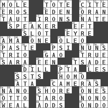 ACROSS 1. Undercover agent 5. Carryall 9. Quote 13. Greek god of love 14. Paradise 15. Northwest Algerian city 16. Drawn tight 17. Metal shackles 18. Nathan's nickname 19. Orator 21. Newt 22. Groove 23. Jane of fiction 24. Wet nurse (var.) 27. Single 28. Margarine 29. Thick mixture 31. Air pressure measure (abbr.) 32. Religious women 36. Musical group of three 37. E Mali city 38. Loyal 39. "Two Mules for Sister ____" 40. Car or cant ending 41. Sadhe (variant) 42. Deli pickle 44. Parent Teacher Association (abbr.) 46. French article 47. Fast planes 48. Like (prefix) 50. "One Day ___ Time" 51. Devices for capturing images 54. Billionth: prefix 56. Dinah or Pauly 58. Singles 60. Von Bismarck 61. Edible starchy tuberous root 62. Words to Nanette 63. Welt 64. Does sums 65. Southwest Nigerian state DOWN 1. Was introduced to 2. Mouths or openings 3. Central Nebraska county 4. _____ Park, CO 5. Cigar-shaped 6. Scent 7. Nine, plus one 8. Followers of ems 9. Meets 10. Feeling or showing extreme anger 11. Make lace 12. Compass dir. 17. Picture 20. Medicinal plant 21. Sight organ 23. Biblical high priest 24. Flats, for short 25. Hindu Mythology: god of death 26. SW Saudi Arabia district 28. Bear (Spanish) 30. Inedible or poisonous agaric 31. Baking dish 33. Mountain range 34. Unadorned 35. Observes 37. Set 40. Raised railways 41. Docile 43. Call ___ day 44. N Egypt peninsula 45. Heavy book 47. Before Barbara or Clara 49. U. of Maine site 51. Drawstring 52. At once, immediately (arch.) 53. Transmit 54. At this time 55. Had dinner 56. R.R. building 57. Possessed 59. "Barney Miller" actor Jack