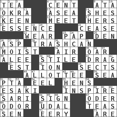 ACROSS 1. Beverage made from leaves 4. Penny 8. "One Day ___ Time" 11. Gumbo ingredient 13. At sea 14. "______ My Girl" (Turtles hit) 15. Peachy ____! 16. Rendezvous 17. Possessive pronoun 18. Gist 21. Stop 22. Erode 23. Infant food 25. Lair 26. Viper 29. File 13 32. Damp 34. Atmosphere 35. Boat paddle 38. Toward shelter 39. Vertical member of a panel or frame 41. To draw with force 43. Eastern Standard Time (abbr.) 44. Electrically charged atom 45. Religious groups 46. One to whom something is allotted 50. Ocean 51. Parent Teacher Association (abbr.) 54. Snakelike fish 55. Coop moms 57. 1973 Nobel Price Winner (Physics) Leo 59. Stimulate to action 63. Indian skirt 64. Public display of a written message 67. River in Europe 68. Aroma 69. Allodial 70. Afternoon social gatherings 71. Elected rep. 72. Suggestive of the supernatural 73. "We ___ not amused" (Victoria) DOWN 1. Puff or smoke 2. Supplements with great effort 3. Ancient Greek god of war 4. Device for capturing images 5. Compass dir. 6. Born 7. Make lace 8. Having the leading position 9. Laconic 10. NE Netherlands city 12. Afresh 14. A female animal or person 19. Remaining after all deductions 20. Auto 21. Accounting whiz (abbr.) 23. Silvers or Donahue 24. Measure of real estate 26. Wet nurse (var.) 27. Not divided or shared with others 28. Sliced desserts 30. Virtuous person 31. Thickened enlargement 33. Bristle 36. Arches 37. Pace 39. Drop; flow; fall 40. Utensil 42. Girls' org. (abbr.) 45. Elected reps. 47. Luau accessory 48. Without force or sincere effort 49. Car or cant ending 51. Mexican monetary units 52. Sadhe (variant) 53. Composer Copland 56. Specific locale 58. Apertif with cassis 60. The main thing one is thinking about 61. Hitchcock's "____ Window" 62. Celtic language 64. Institute legal proceedings 65. Binary compound 66. Slender fish