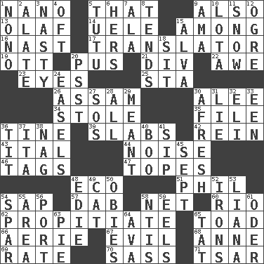 ACROSS 1. Billionth: prefix 5. Not this but _ 9. In addition 13. Norwegian king 14. Ubangi River tributary 15. Amid 16. Political cartoonist Thomas 17. Interpreter 19. Baseball player Mel 20. Ichor 21. HTML Container Element 22. Deep reverence 23. Sight organs 25. R.R. building 26. Indian state 30. Toward shelter 34. Took without asking 35. Do some clerical work 36. Prong on a fork 39. Thick slices 42. It's straight from the horse's mouth 43. Slanted text style (abbr.) 44. Annoying sound 46. Labels 47. Drinks excessively 48. Environmental prefix 51. Silvers or Donahue 54. Plant excrement 57. Pat or tap gently 58. Fish or hair follower 60. River (Sp.) 62. Appease 65. Frog relative 66. Nest on high 67. Tending to cause great harm 68. Queen of England 1702-14 69. Assign a rank or rating to 70. Backtalk 71. Russian ruler of old DOWN 1. Words to Nanette 2. Having winglike extensions 3. Offensive 4. Often (poetically) 5. Ballerina skirt 6. Possessive pronoun 7. Insect wing 8. Watches over 9. Housemaid (var.) 10. Globular water bottle used in Asia 11. Overwhelm 12. Legendary monster 15. Inventor's middle name 18. Be seated 20. Inconspicuous attention getter 24. Artist's stands 27. Mayday 28. 100% 29. Intended 30. Anew 31. Falsehood 32. Connecticut Ivy Leaguer 33. Car or cant ending 36. Teat (slang) 37. Call ___ day 38. Tired old horse 40. Surprise greeting 41. Small drink 45. Back-to-school mo. 48. Singer Brickell 49. Feline 50. Off-Broadway awards 52. Removes the wrinkles 53. Climbing, woody, usually tropical vines 54. Practice fight 55. Length times width 56. Sweet dark-red dessert wine 58. Nuclear Threat Initiatives 59. Snakelike fish 61. Baltic tributary 63. Sliced dessert 64. Actress Gardner 65. Make lace