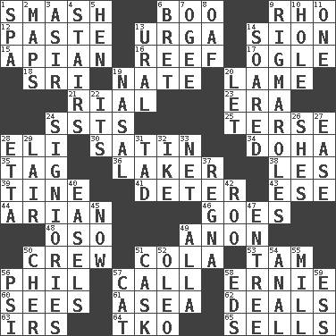 ACROSS 1. Box-office sellout 6. Surprise greeting 9. 17th letter of the Greek alphabet 12. Thick mixture 13. Capital and largest city of Mongolia 14. The Jewish people; Israel 15. Bee-related 16. Coral collection 17. Stare at amorously 18. _ Lanka 19. Nathan's nickname 20. Unable to walk 21. Monetary unit of Yemen 23. Epoch 24. Fast planes 25. Laconic 28. Biblical high priest 30. Smooth fabric 34. Capital of the state of Qatar 35. Label 36. Member of a famous L.A. basketball team 38. French article 39. Prong on a fork 41. Prevent from occurring 43. Compass dir. 44. Believer in; advocate of (suffix) 46. Leaves 48. Bear (Spanish) 49. At once, immediately (arch.) 50. Ship's personnel 51. Root beer relative 53. Scottish cap 56. Silvers or Donahue 57. Give a ring to 58. Bert's buddy 60. Observes 61. At sea 62. Allots cards 63. Big collection agency 64. Ring climax 65. Exchanges for money DOWN 1. Health resort 2. Atlas contents 3. SW Saudi Arabia district 4. Flight of steps 5. Layer 6. Cy Young winner Saberhagen 7. Double curve, resembling the letter S 8. Clumsy lout 9. Frustrating wastes of time 10. Hollow 11. Single 13. Mountain range 14. Flew 19. Rhinal 20. Allow 22. It is 24. Seigniories (variant) 26. "______ My Girl" (Turtles hit) 27. Relaxation 28. Singer James 29. Den 31. Bit 32. Eisenhower's nickname 33. Fish or hair follower 37. Rain (Swedish) 40. Artist's stands 42. Friend of Pooh 45. Immediately 47. Main course 49. Silent film actress Nazimova 50. "Mermaids" star 51. Keg 52. Margarine 54. Of or related to the anus 55. Place where flour is made 56. 23rd letter of the Greek alphabet 57. Domesticated feline 58. Begley and Asner 59. Double-curved letter