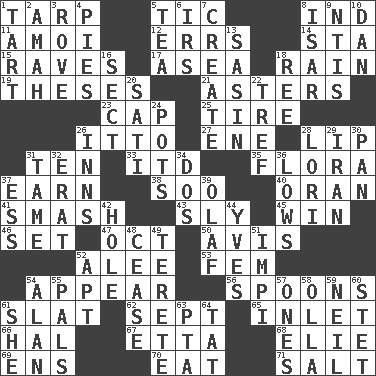ACROSS 1. Canvas cover 5. Nervous spasm 8. Indiana (abbr.) 11. Mine, in Marseilles 12. Blunders 14. R.R. building 15. All-night dance parties 17. Toward the sea 18. Water falling in drops from the sky 19. College papers 21. Michaelmas daisies 23. Head covering 25. Become fatigued 26. "Tell ____ the Marines!" 27. Compass dir. 28. Mouth edge 31. "___ Little Indians" 33. It would 35. Plants 37. Merit 38. "Barney Miller" actor Jack 40. NW Algerian seaport 41. Box-office sellout 43. Stealthy 45. Acquire through effort 46. Arrange properly for use 47. Sep. follower 50. Opinion 52. Toward shelter 53. Opposite of masc. 54. Become visible 56. Soup utensils 61. Narrow board 62. Back-to-school mo. 65. An arm off of a larger body of water 66. Actor Linden 67. Singer James 68. Writer Wiesel 69. Followers of ems 70. Consume 71. Table seasoning DOWN 1. Small pie 2. Nursemaid 3. Be footloose 4. Sliced desserts 5. Beverage made from leaves 6. Big collection agency 7. Make 8. Austrian river, tributary to the Danube 9. Nuclear Threat Initiatives 10. One of the 12 tribes of Israel 13. Indian antelope 16. Religious group 18. To separate or throw off 20. Suttee (variant) 22. Not kosher 24. Plant holders 26. Restaurants 28. Australian parrot (variant) 29. SW Asia republic 30. Baking dish 31. Not wild 32. Part of Q.E.F. 34. Two (Sp.) 36. Moos 37. Curvy letter 39. Norwegian king 42. Opening into or through something 44. Jacques Cousteau's middle name 48. Desist 49. Cigar-shaped 51. Body of Kaffir warriors 52. Fitting 54. ____ Jay Lerner 55. Friends 57. Washington bills 58. Spanish pot 59. Famous astronaut Armstrong 60. Proofreading order 61. A female animal or person 63. Parent Teacher Assoc. 64. Make lace