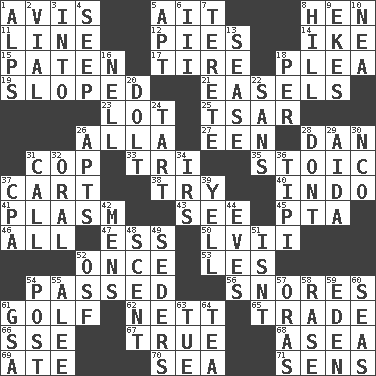 ACROSS 1. Deliberation 5. Small island 8. Layer 11. Actor's bit 12. Sliced desserts 14. Eisenhower's nickname 15. Eucharist need 17. Hoop that covers a wheel 18. Entreaty 19. Slanted 21. Artist's stands 23. Car dealer's back yard 25. Russian ruler of old 26. Silent film actress Nazimova 27. Car or cant ending 28. Daniel's nick name 31. Police officer (slang) 33. Three (prefix) 35. Unemotional 37. Haul 38. Attempt 40. _ china 41. Suffix with ecto or cyto 43. Perceive with the eye 45. Parent Teacher Association (abbr.) 46. 100% 47. Double-curved letter 50. 57 in ancient Rome 52. At one time in the past 53. French article 54. Went by 56. Sounds asleep 61. _ course 62. Remaining after all deductions 65. Exchange 66. Compass dir. 67. Loyal 68. At sea 69. Had dinner 70. Ocean 71. Elected reps. DOWN 1. High mountains 2. Small bottle 3. To the inside or interior of 4. Ooze 5. Fitting 6. One more than two 7. Cigar-shaped 8. Land elevation 9. Makes supply last 10. Teachers' org. 13. Gospel singer Marvin 16. 1994 drama film starring Jodie Foster 18. For each 20. Stupid person 22. Without 24. Small pie 26. Tenement units (abbr.) 28. Do not 29. Opera by Verdi 30. Non-commissioned officer (abbr.) 31. Give a ring to 32. Relating to the mouth 34. Big collection agency 36. Native american tent (variation) 37. Numbers guy (abbr.) 39. Shout 42. Not women's 44. Nights before holidays 48. Odor 49. Spring feasts 51. Is not 52. Order of Saint Francis (abbr.) 54. Mail 55. Toward shelter 57. Mouths or openings 58. Raze (variant) 59. Paradise 60. Oceans 61. Girls' org. (abbr.) 63. Third day of the wk. 64. Afternoon social gathering
