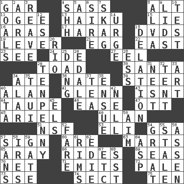 ACROSS 1. Slender fish 4. Backtalk 8. Keyboard modifier key 11. Double curve, resembling the letter S 13. Japanese verse 15. Untruth 16. Caspian sea tributary 17. Ethiopian city, capital of Harari 18. Movie discs 19. Prying instrument 21. Oval reproductive body of a fowl 22. 90 degrees 23. Perceive with the eye 24. Binary compound 27. Snakelike fish 29. Frog relative 30. Before Barbara or Clara 34. Had dinner 36. Nathan's nickname 39. Navigate 40. Actor Alda or Thicke 41. American astronaut and politician John 43. Is not 44. Grayish beige 46. Relaxation 47. Baseball player Mel 48. Satellite of Uranus 49. Uhlan (variant) 51. Science/research agcy. 53. Connecticut Ivy Leaguer 54. Girls' org. (abbr.) 57. Public display of a written message 60. "We ___ not amused" (Victoria) 63. Shops 65. Like ___ of sunshine 66. Amusement-park features 69. Oceans 70. Fish or hair follower 71. Sends forth 72. Light colored 73. Compass dir. 74. Religious group 75. "___ Little Indians" DOWN 1. Purposes of endeavors 2. Match 3. Break or tear apart 4. Quiet! 5. American Automobile Association (abbr.) 6. Male parent of an animal 7. Heroin 8. Inventor's middle name 9. Flaplike coverings 10. Trial 12. Compass dir. 14. Goad 18. Conveyance 20. _ de Janeiro 25. Mild oath, euphamism for damn 26. Peak District village in England 28. Double-curved letter 29. 3-inch nail 31. Egg locale 32. Portable shelter 33. Tate display 34. Having or resembling wings 35. "Change" in Tahitian 37. Beverage made from leaves 38. Follow as a consequence or result 40. _ moment's notice (2 wds.) 42. 1994 drama film starring Jodie Foster 45. Raised railways 50. Direct toward a target or goal 52. Conductor's collection 54. Relatively large 55. Having lost freshness 56. NE Netherlands city 57. Without 58. Angers 59. Yard entry 61. Basketball hoops 62. Singer Brickell 64. Cleo's killer 67. And so on (abbr.) 68. Fast jet (abbr.)