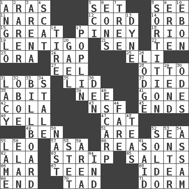 ACROSS 1. Caspian sea tributary 5. Arrange properly for use 8. Observe 11. Drug cop 12. Drawstring 14. Globe 15. Relatively large 17. Abounding in pines 18. _ de Janeiro 19. Small, flat, pigmented spot on the skin 21. Elected rep. 22. "___ Little Indians" 23. Mouth or opening 24. Strike 25. Connecticut Ivy Leaguer 27. Snakelike fish 28. Von Bismarck 31. Tennis shots 35. Hat (slang) 37. Passed on 38. "This won't hurt ____!" 39. Born 41. Went 42. Root beer relative 43. Overdraft (abbr.) 45. Extremities 46. Shout 47. Feline 49. Benjamin's nick name 51. "We ___ not amused" (Victoria) 52. Ocean 55. Lion 57. White ___ sheet 60. Thinks logically 62. According to 63. Long narrow piece of something 65. Table seasonings 66. Make imperfect 67. Adolescent 68. The content of cognition 69. Conclude 70. Bit 71. Dormintory (informal) DOWN 1. White American of non-Hispanic descent 2. Less widely known 3. Sports stadium 4. Leave at once 5. _-fi 6. Immeasurably long periods of time 7. Family _ (genealogy) 8. Conclusion 9. One of the Great Lakes 10. Inky black, to poets 13. Centimeter-gram-second unit of force 16. Hoop that covers a wheel 17. Cotton for raincoats, e.g. 20. Highlander 26. Cabin 29. Look after 30. Lyric poems 31. Made of lace 32. Mitch Miller's instrument 33. Big road sign 34. Lacking originality or spontaneity 36. Lair 40. Fortification 44. Conductor's collection 48. Afternoon social gatherings 50. Political cartoonist Thomas 52. Twentieth part of a lira 53. Keyboard key 54. Indian state 55. Unable to walk 56. Liveliness 58. Proofreading order 59. Type of rug 61. Expressed in words 64. Working for oneself (abbr.)