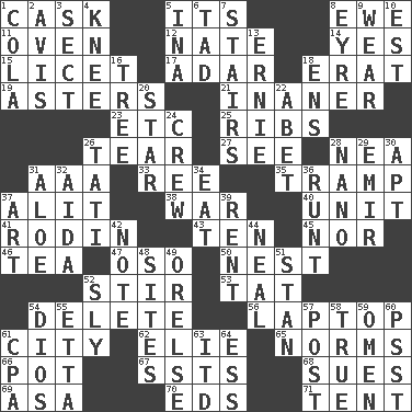ACROSS 1. Keg 5. It is 8. She-sheep 11. Baking chamber 12. Nathan's nickname 14. Consenting reply 15. It is permitted: Lat. 17. The sixth month of the Jewish calendar 18. Part of Q.E.F. 19. Michaelmas daisies 21. More empty; more void 23. And so on (abbr.) 25. Chest bones 26. Pull into pieces 27. Observe 28. Teachers' org. 31. American Automobile Association (abbr.) 33. To sift 35. _____ steamer (cargo ship) 37. Set down 38. Armed conflict 40. A single undivided whole 41. "The Thinker" sculptor 43. "___ Little Indians" 45. Or not 46. Beverage made from leaves 47. Bear (Spanish) 50. Egg locale 52. Use a swizzle stick 53. Make lace 54. Keyboard key 56. Portable computer 61. Municipality 62. Writer Wiesel 65. Typical models 66. Cooking vessel 67. Fast planes 68. Takes to court 69. White ___ sheet 70. Begley and Asner 71. Portable shelter DOWN 1. Root beer relative 2. Advice 3. Religious group 4. Leg joint 5. _ tizzy (2 wds.) 6. Small boy 7. Flight of steps 8. Jane of fiction 9. Erode 10. Eastern Standard Time (abbr.) 13. Bert's buddy 16. Family _ (genealogy) 18. Followers of ems 20. Play the lead 22. Collude with 24. Ship's personnel 26. Jacques of French films 28. Billionth: prefix 29. Arab leader 30. Fitting 31. _ vera 32. Opera by Verdi 34. Erode 36. The smallest animal of a litter 37. Nonscientific branch of learning 39. Monthly bill 42. Brief written record 44. Be tempered by heat 48. Settings 49. Threatening words 51. Comedian Laurel of Laurel & Hardy 52. Secret 54. "Vaya con ____" 55. Singer James 57. Mail 58. Loyal 59. Sign of something about to happen 60. Inconspicuous attention getter 61. Numbers guy (abbr.) 63. It would 64. Curvy letter