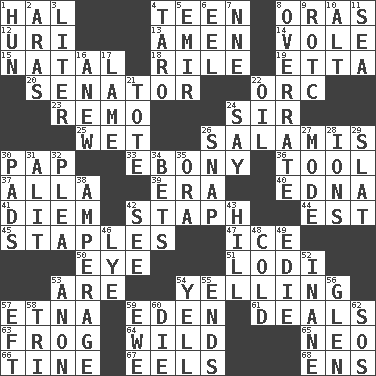 ACROSS 1. Actor Linden 4. Adolescent 8. Mouths or openings 12. RI univ. 13. So be it 14. Grand slam 15. Brizilian seaport 18. Cause heat under the collar 19. Singer James 20. Legislator 22. The grampus (Milton) 23. San ____ (Riviera town) 24. Title for a knight 25. Soggy 26. Deli grouping 30. Infant food 33. Dark wood 36. Instrument 37. Silent film actress Nazimova 39. Period 40. Pulitzer Prize-winning author Ferber 41. South Vietnam president (1954) 42. Staphylococcus 44. Eastern Standard Time (abbr.) 45. Paper fasteners 47. Frozen water 50. Sight organ 51. Farming town in central California 53. "We ___ not amused" (Victoria) 54. Crying or shouting loudly 57. Inactive volcano in Sicily 59. Paradise 61. Allots cards 63. Toadlike animal 64. Rampant 65. Modern: prefix 66. Prong on a fork 67. Snakelike fish 68. Followers of ems DOWN 1. Attila the _ 2. Ancient river in northeast Turkey 3. 61 cubic inches 4. Pacific island yam 5. Independent ruler or chieftain 6. Snakelike fish 7. Compass dir. 8. Make much ado about nothing 9. College mil. group 10. Keyboard modifier key 11. Ocean 16. Afresh 17. Unable to walk 21. Haul 22. Lubricate 24. Declare 26. Fastener 27. Method 28. Charged atoms 29. Narrow board 30. Groovy apts. 31. Set down 32. Entreaty 34. Antes 35. Mouth or opening 38. Electrical Measurement 42. Observe 43. Land elevation 46. Sodium hydroxide 48. Lacking warmth 49. Singer Brickell 52. Silly 53. Soon (poet.) 54. Shout 55. Extremities 56. Small, secluded valley 57. Newt 58. Three (prefix) 59. She-sheep 60. Expire 62. Mayday