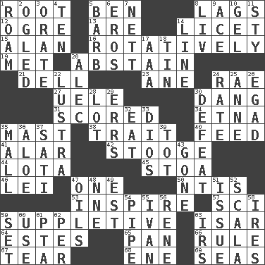 ACROSS 1. Carrot, for example 5. Benjamin's nick name 8. Falls behind 12. Legendary monster 13. "We ___ not amused" (Victoria) 14. It is permitted: Lat. 15. Actor Alda or Thicke 16. Happening in regular succession 19. Was introduced to 20. Refrain by choice 21. Small valley 23. A saturated hydrocarbon 24. Actress Charlotte 27. Ubangi River tributary 30. Mild oath, euphamism for damn 31. Tallied 34. Inactive volcano in Sicily 35. Vertical spar for supporting sails 38. Distinguishing feature 40. Nourish 41. Having or resembling wings 42. Moe Howard, for one 44. Globular water bottle used in Asia 45. Portico 46. Flowery wreath 47. Single 50. Nuclear Threat Initiatives 53. Motivate 57. _-fi 59. Supplementary 63. Austrian river, tributary to the Danube 64. _____ Park, CO 65. Baking dish 66. Governing power 67. Separate forcefully 68. Compass dir. 69. Oceans DOWN 1. Wander aimlessly 2. Stared at amorously 3. Speak pompously 4. Nine, plus one 5. Sharp remark 6. Greek god of love 7. Remaining after all deductions 8. 54 in ancient Rome 9. Adept person 10. Set 11. Filthy place 14. Actor's bit 17. Auto club (abbr.) 18. Shallow baking pan 20. Actor Baldwin 22. A period of five years 24. Pace 25. Queen of England 1702-14 26. Mild oath 28. Car dealer's back yard 29. Blunders 30. Outscore 32. Consume 33. "Vaya con ____" 35. Shopping center 36. Medicinal plant 37. Suttee (variant) 39. Small child 43. Went 47. Petroleums 48. Compass dir. 49. Eastern Standard Time (abbr.) 51. Come out of 52. Any of the three canals of the cochlea 54. Corncob 55. _ the terrible 56. French philosopher Descartes 58. Angers 59. Put into a specified state 60. Purpose 61. Parent Teacher Assoc. 62. For each 63. Big collection agency