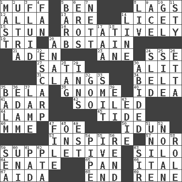 ACROSS 1. Perform or handle clumsily 5. Benjamin's nick name 8. Straggles 12. Silent film actress Nazimova 13. "We ___ not amused" (Victoria) 14. It is permitted: Lat. 15. Make senseless or dizzy 16. Producing rotation 19. Three (prefix) 20. Choose not to consume 21. Arabian gulf 23. One (Scot) 24. Compass dir. 27. Suttee (variant) 30. Came down and settled, as after flight 31. Rigngs loudly 34. Waist strap 35. Actor Lugosi 38. Dwarf 40. The content of cognition 41. The sixth month of the Jewish calendar 42. Dirtied 44. Desk light 45. Event that recurs at intervals 46. Madame (abbr.) 47. Enemy 50. Goddess of spring and wife of Bragi 53. Stimulate to action 57. Or not 59. Supplementary 63. Grain storage tower 64. Related on the mother's side 65. Baking dish 66. Slanted text style (abbr.) 67. Opera by Verdi 68. Conclusion 69. French philosopher Descartes DOWN 1. Vertical spar for supporting sails 2. Extreme 3. Watery 4. Air blower 5. Sharp remark 6. Greek god of love 7. Remaining after all deductions 8. 54 in ancient Rome 9. Adept person 10. Set 11. Filthy place 14. Actor's bit 17. American Automobile Association (abbr.) 18. Shallow baking pan 20. Of or related to the anus 22. Fortification 24. Downhill vehicle 25. Filth; sediment 26. Singer James 28. Label 29. Taverns 30. Stayed 32. Thick or sticky substance 33. Stricken, poetically 35. Lip ointment 36. Dutch treat 37. Unable to walk 39. Biblical high priest 43. Singer Brickell 47. Do some clerical work 48. Single 49. Eastern Standard Time (abbr.) 51. Join together 52. Pitcher Ryan 54. Corncob 55. "Terrible" tsar 56. Tear apart 58. Hero or heavy, e.g. 59. Ocean 60. Single; one (prefix) 61. Writing tablet 62. Parent Teacher Assoc. 63. Title for a knight