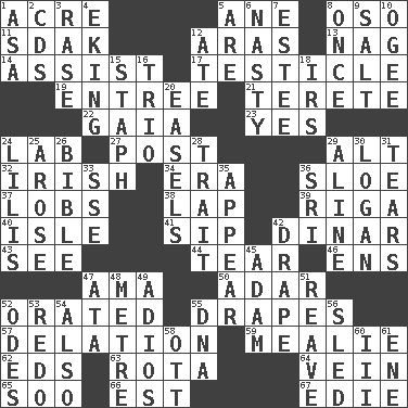 ACROSS 1. 43,560 square feet 5. A saturated hydrocarbon 8. Bear (Spanish) 11. Neighbor of Neb. 12. Caspian sea tributary 13. Tired old horse 14. Aid 17. A testis 19. Main course 21. Cylindrical with tapered ends 22. Greek goddess of the earth (variant) 23. Consenting reply 24. Experiment locale 27. Mail 29. Keyboard modifier key 32. From or relating to Ireland 34. Epoch 36. _ gin 37. Tennis shots 38. Pet locale 39. Port city in Latvia 40. Small island 41. Small drink 42. Middle Eastern gold or silver currency 43. Perceive with the eye 44. Rend 46. Followers of ems 47. Nursemaid (var.) 50. The sixth month of the Jewish calendar 52. Declaimed 55. Window treatments 57. Accusation by an informer 59. Ear of corn 62. Begley and Asner 63. Round or rotation of duties 64. Distinctive style or manner 65. "Barney Miller" actor Jack 66. Eastern Standard Time (abbr.) 67. Singer Brickell DOWN 1. White ___ sheet 2. Music discs 3. Raze (variant) 4. Supplementing with great effort 5. "We ___ not amused" (Victoria) 6. Thoroughly unpleasant 7. First name in cosmetics 8. Single time 9. Table seasoning 10. Double curve, resembling the letter S 12. Had dinner 15. Staphylococcus 16. Musical group of three 18. Big collection agency 20. Artist's stands 24. Ms. Damita and namesakes 25. Came up 26. The Good Book 28. Distinguishing feature 29. Place in a line 30. Utah city north of Ogden 31. Rends 33. Compass dir. 35. Seem 36. _ Lanka 42. Window treatment 45. First man 47. _ moment's notice (2 wds.) 48. Distance measurement (Brit.) 49. Goodbye (Sp.) 51. Rob, plunder, or pillage 52. Lyric poems 53. Do over again 54. In addition 55. Heredity factor (abbr.) 56. Downhill vehicle 58. Baseball player Mel 60. One more than two 61. Compass dir.
