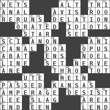 ACROSS 1. Soaks 5. The first octave above the treble staff 8. Three (prefix) 11. Of or related to the anus 12. Advice 13. Friend of Pooh 14. Summer TV shows 17. Conveyance 19. Declaimed 21. Foolish or stupid persons 22. Play the lead 23. Observe 24. _-fi 27. At once, immediately (arch.) 29. Cuckoo 32. Lessep's creation 34. ___ good deed 36. Musical composition 37. Blind as ____ 38. Followers of ems 39. Christmas carol 40. Actor's bit 41. Put into a specified state 42. Effrontery 43. A saturated hydrocarbon 44. Through, poetically 46. Small child 47. Shoshoni 50. Count _ (2 wds.) 52. Went by 55. Sunflower state 57. Electrical Measurement 59. Cease 62. Area sheltered from the wind 63. Volcanic refuse 64. Type of rug 65. Conclusion 66. Car or cant ending 67. Grant temporary use of DOWN 1. Armed conflict 2. Compass dir. 3. Pacific island yam 4. Disparaging remarks 5. "___ Maria" 6. Ms. Damita and namesakes 7. Sadhe (variant) 8. Musical group of three 9. Carrot, for example 10. Charged atoms 12. Find the sum of 15. Relating to or accompanying birth 16. Comedian Laurel of Laurel & Hardy 18. Neckwear 20. Eats (away) 24. Any of the three canals of the cochlea 25. Apartment or room in a ship 26. Silly 28. Music written for nine 29. To the left, to Queeg 30. New (sp.) 31. Small island 33. Had dinner 35. Respiratory problem 36. Single 42. Annoying sound 45. Tear apart 47. Purpose 48. Laconic 49. Peak District village in England 51. Rhinal 52. Light colored 53. So be it 54. Moved rapidly 55. Barrel 56. Father 58. Separate the seeds from cotton 60. Elected rep. 61. Small amount or degree