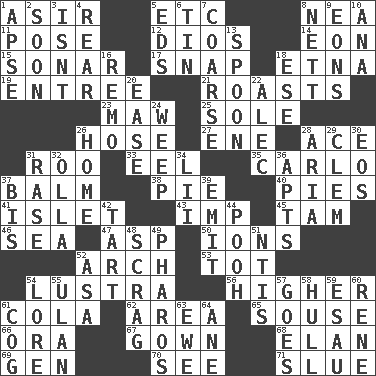 ACROSS 1. SW Saudi Arabia district 5. And so on (abbr.) 8. Teachers' org. 11. Introduce or present, as a question 12. "Vaya con ____" 14. Age 15. Underwater navigation system 17. Fastener 18. Inactive volcano in Sicily 19. Main course 21. Cooks with dry heat, as in an oven 23. Informal term for the mouth 25. Not divided or shared with others 26. Flexible conduit 27. Compass dir. 28. Adept person 31. Friend of Pooh 33. Snakelike fish 35. Monte _, Las Vegas Hotel/Casino 37. Lip ointment 38. Sliced dessert 40. Sliced desserts 41. Small island 43. Naughty child 45. Scottish cap 46. Ocean 47. Viper 50. Charged atoms 52. Bowlike part 53. Small child 54. A period of five years 56. Having greater elevation 61. Root beer relative 62. Length times width 65. Boozer 66. Mouth or opening 67. Long dress 68. Liveliness 69. Commissioned military rank (abbr.) 70. Observe 71. Change direction abruptly DOWN 1. Domed church section 2. Within a short period 3. Is not 4. Located in or toward the back 5. Begley and Asner 6. Metal container 7. Unrefined 8. Remaining after all deductions 9. Immeasurably long periods of time 10. Santa ___, CA 13. Soup utensil 16. San ____ (Riviera town) 18. Compass dir. 20. Comfort 22. Actor Baldwin 24. Shed a tear 26. Dwelling 28. Roberta Peters solo 29. Clement's nick name 30. Greek goddess of the dawn 31. To erase 32. Spanish pot 34. Cards in a Roman deck? 36. Tenement units (abbr.) 37. Twice 39. Give off 42. Small pie 44. "Silly old bear" 48. Lean end of the neck 49. N Egypt peninsula 51. Nuclear Threat Initiatives 52. White ___ sheet 54. Old wives' tales, e.g. 55. ____ Bator 57. Moves 58. Frame or body of a ship 59. He sold his birthright 60. French philosopher Descartes 61. Gear tooth 63. She-sheep 64. A saturated hydrocarbon