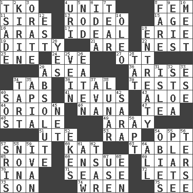 ACROSS 1. Ring climax 4. A single undivided whole 8. Opposite of masc. 11. Male parent of an animal 13. Cowboy competition 15. Mature 16. Caspian sea tributary 17. Perfect 18. One of the Great Lakes 19. Short, simple song 21. "We ___ not amused" (Victoria) 22. Egg locale 23. Compass dir. 24. First lady 27. Baseball player Mel 29. Toward the sea 30. Get up 34. Bar bill 36. Slanted text style (abbr.) 39. Trials 40. Plant excrements 41. Mole, birthmark 43. Medicinal plant 44. Greek mythologigal hunter 46. Nanny 47. Beverage made from leaves 48. Having lost freshness 49. Like ___ of sunshine 51. Shoshoni 53. Reproach for some lapse or misdeed 54. Elect 57. In a ____ (agitated or irritated) 60. Krazy ___ of comics 63. Eating place 65. Be footloose 66. Follow as a consequence or result 69. One who doesn't tell the truth 70. _ tizzy (2 wds.) 71. Gospel singer Marvin 72. Allows 73. Boy, to dad 74. Songbird 75. Observe DOWN 1. Sadhe (variant) 2. Japanese brewing company 3. Declaim 4. RI univ. 5. Dreamland 6. It may be bright or harebrained 7. Pull into pieces 8. Conductor's collection 9. The front part of a cuirass 10. Confront 12. Eastern Standard Time (abbr.) 14. Margarine 18. Plea 20. It is so 25. Distinctive style or manner 26. Eroded 28. Make lace 29. Utter; complete 31. Small island 32. Portico 33. Compass dir. 34. Small pie 35. Capital of Western Samoa 37. Actress Gardner 38. Type of eclipse 40. Mayday 42. "Two Mules for Sister ____" 45. Fish or hair follower 50. Fitting 52. Supplements with great effort 54. Off-Broadway awards 55. Food holder 56. Laconic 57. Indian titles of respect 58. Words to Nanette 59. "Terrible" tsar 61. Afresh 62. Russian ruler of old 64. 100% 67. Purpose 68. Car or cant ending