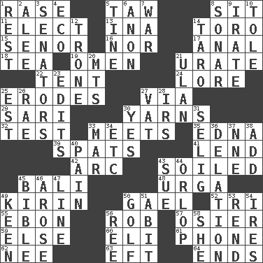 ACROSS 1. Raze (variant) 5. The 23rd letter of the Hebrew alphabet 8. Be seated 11. Choose 13. _ tizzy (2 wds.) 14. "Corrida" creature 15. Sir (Sp.) 16. Not either 17. Of or related to the anus 18. Afternoon social gathering 19. Sign of things to come 21. A salt of uric acid 22. Portable shelter 24. Old wives' tales, e.g. 25. Eats (away) 27. By way of 29. Indian skirt 30. Tall tales 32. Trial 33. Confronts 35. Pulitzer Prize-winning author Ferber 39. Arguments over trivial matters 41. Grant temporary use of 42. Curve 43. Dirtied 45. Indonesian resort city 48. Capital and largest city of Mongolia 49. Japanese brewing company 50. Highlander 52. Three (prefix) 55. Inky black, to poets 56. Director Reiner 57. Flexible twig of a willow tree 59. Otherwise 60. Connecticut Ivy Leaguer 61. Give a jingle 62. Born 63. Newt 64. Extremities DOWN 1. Remainder 2. Toward shelter 3. Legislators 4. Environmental prefix 5. Prong on a fork 6. Soon (poet.) 7. Armed conflict 8. Underwater navigation system 9. Feeling or showing extreme anger 10. Lacquered or enameled metalware 12. Heavy duty weighing machine 14. Pacific island yam 20. Mountains (abbr.) 21. Uhlan (variant) 23. Prepares for publication 25. Eastern Standard Time (abbr.) 26. Actress Charlotte 27. Large container 28. Big collection agency 30. Consenting reply 31. Major League Baseball Commissioner Bud 33. Impair 34. And so on (abbr.) 36. Accusation by an informer 37. Compass dir. 38. Say or write further 40. Ache 43. Take to court 44. Lowest deck of a ship 45. God's Word 46. Came up 47. Actor's bit 49. Peachy ____! 50. _ course 51. "This won't hurt ____!" 53. Tear apart 54. Angers 56. To riddle 58. A female animal or person