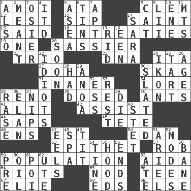 ACROSS 1. Mine, in Marseilles 5. "One Day ___ Time" 8. Clement's nick name 12. For fear that 13. Small drink 14. Inhabitant of Heaven 15. Stated 16. Pleas 19. Single 20. More lively and spirited 21. Musical group of three 23. Heredity factor (abbr.) 24. Call ___ day 27. Capital of the state of Qatar 30. Heroin 31. More empty; more void 34. Old wives' tales, e.g. 35. Former U.S. Attorney General Janet 38. Administered medicine 40. Pismires 41. Set down 42. Help 44. Plant excrements 45. Wig 46. Followers of ems 47. Eastern Standard Time (abbr.) 50. Dutch treat 53. Curse 57. Director Reiner 59. Census information 63. Opera by Verdi 64. Disturbances 65. Allow head to fall sleepily 66. Adolescent 67. Writer Wiesel 68. Begley and Asner 69. Otherwise DOWN 1. In addition 2. Intended 3. Flexible twig of a willow tree 4. It would 5. At sea 6. Airtight sealed metal containers 7. Tenement units (abbr.) 8. Domesticated feline 9. Cards in a Roman deck? 10. Compass dir. 11. Mountains (abbr.) 14. "Two Mules for Sister ____" 17. To free from 18. Car or cant ending 20. Within a short period 22. Foolish or stupid persons 24. Visual representation of an object 25. Small pie 26. Eras 28. Possessed 29. Small Philippine buffalo 30. Scheduled 32. Double-curved letter 33. Repose 35. To erase 36. Enthusiasm 37. Pinches, bites 39. Expire 43. Proofreading order 47. Snakelike fish 48. Health resort 49. Teat (slang) 51. Satellite of Uranus 52. Methods 54. Prong on a fork 55. Parka part 56. Extremities 58. Object of repulsion 59. Before (prefix) 60. Petroleum 61. Luau course 62. Shoshoni 63. Had dinner