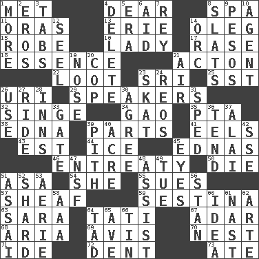 ACROSS 1. Was introduced to 4. Letter starter 8. Health resort 11. Mouths or openings 13. 4th largest of the Great Lakes 14. Cassini of fashion 15. Loose flowing garment 16. Kenny Rogers chart-topper in '80 17. To erase 18. Gist 21. 13-14th century defensive garment 22. Spoils 23. Indian title of respect (Mr.) 25. Fast jet (abbr.) 26. RI univ. 29. Orators 32. Scorch 34. E Mali city 35. Parent Teacher Association (abbr.) 38. Pulitzer Prize-winning author Ferber 39. Components 41. Snakelike fish 43. Eastern Standard Time (abbr.) 44. Frozen water 45. Ferber et al. 46. Plea 50. Pass on 51. White ___ sheet 54. A female animal or person 55. Institutes legal proceedings 57. Bundle of cut stalks of grain 59. French poetic form 63. "Two Mules for Sister ____" 64. Jacques of French films 67. The sixth month of the Jewish calendar 68. Operatic vocal solo 69. Deliberation 70. A home for chicks 71. Binary compound 72. Gouge 73. Had dinner DOWN 1. Greater amount 2. Greek god of love 3. Bar bills 4. Erase 5. Period 6. Help 7. Marina Del _, California 8. Narrow boards 9. Mexican monetary units 10. Rep 12. Sew up the eyelids of hawks and falcons 14. The grampus (Milton) 19. Sense of smell 20. Police officer (slang) 21. Wind 23. Three-handed card game 24. Vintage cars 26. Purpose 27. Travel on or in a vehicle 28. Lodging establishments 30. Match 31. Moved rapidly 33. Yard entry 36. Be inclined (to) 37. Jai ____ 39. Essential or central part 40. Land measure 42. Compass dir. 45. Snake ____ (dice throw) 47. Overdraft (abbr.) 48. Aid 49. Third day of the wk. 51. Slender Brazilian palm 52. Pottery fragment 53. Nest on high 56. Comedian Laurel of Laurel & Hardy 58. Auto club (abbr.) 60. It may be bright or harebrained 61. Political cartoonist Thomas 62. Johnson of "Laugh-In" 64. Small amount or degree 65. "___ Maria" 66. Shallow baking pan