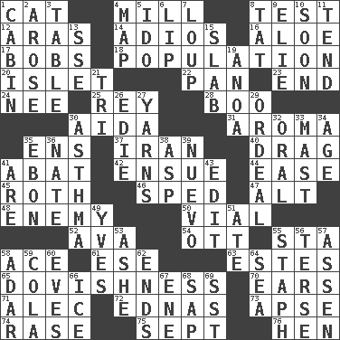 ACROSS 1. Feline 4. Place where flour is made 8. Trial 12. Ancient river in northeast Turkey 14. Goodbye (Sp.) 16. _ vera 17. Moves up and down 18. Census information 20. Small island 22. Baking dish 23. Conclude 24. Born 25. Marina Del _, California 28. Sometimes accompanies a hiss 30. Opera by Verdi 31. Scent 35. Followers of ems 37. SW Asia republic 40. To trail on the ground 41. Blind as ____ 42. Take place subsequently 44. Comfort 45. Writer of Portnoy's Complaint (1969) 46. Hurried 47. The first octave above the treble staff 48. Foe 50. Small bottle 52. Actress Gardner 54. Baseball player Mel 55. R.R. building 58. Adept person 61. Compass dir. 63. _____ Park, CO 65. Innocence, gentleness, or tenderness 70. Hearing organs 71. Actor Baldwin 72. Ferber et al. 73. Domed church section 74. Raze (variant) 75. Back-to-school mo. 76. Layer DOWN 1. Apartment or room in a ship 2. Came up 3. Eating place 4. Atlas unit 5. Wedding promise 6. Mouth edge 7. Central Nebraska county 8. Make lace 9. Writer Wiesel 10. Within a short period 11. Look after 13. Compass dir. 15. Broad, flat, thick piece 19. Small Philippine buffalo 21. Three (prefix) 26. Singer Brickell 27. Tall tales 29. Severe or trying experience 30. Respiratory problem 32. Relating to the mouth 33. Vertical spar for supporting sails 34. Ripen 35. Inky black, to poets 36. Nathan's nickname 38. Viper 39. New (sp.) 41. "We ___ not amused" (Victoria) 43. Prepare for publication 49. Jacques Cousteau's middle name 51. Had dinner 53. American tennis player Robert 55. Staphylococcus 56. Laconic 57. NE Netherlands city 58. The sixth month of the Jewish calendar 59. Root beer relative 60. Nights before holidays 62. Extremities 64. Ocean 66. Frozen water 67. Compass dir. 68. Plant excrement 69. Fast jet (abbr.)