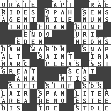 ACROSS 1. Declaim 6. Fitting 9. Actress Charlotte 12. Amusement-park features 13. Brightly colored fish 14. Elected reps. 15. Representative 16. The longest river in the world 17. Religious women 18. Indiana (abbr.) 19. Dutch treat 20. Went 21. Inside; within (prefix) 23. RI univ. 24. Genesis locale 25. Catcalls? 28. One of the 12 tribes of Israel 30. Make _____ (do battle with) 34. Fastener 35. Keyboard modifier key 36. Inhabitant of Heaven 38. Lyricist Gershwin 39. Drug cop 41. Entreaties 43. Fast jet (abbr.) 44. Relatively large 46. Get outta here! 48. Nanny (var.) 49. Nuclear Threat Initiatives 50. Proofreading order 51. A type of plum 53. Mayday 56. Den 57. Connect, as a bridge 58. 61 cubic inches 60. Type of rug 61. San ____ (Riviera town) 62. First name in cosmetics 63. Altar cloth linen 64. Binary compound 65. Fur scarf DOWN 1. Mouth or opening 2. Swiss mountan, "Queen of the Mountains" 3. Arabian gulf 4. Watched over 5. Eastern Standard Time (abbr.) 6. Capital of Western Samoa 7. Inside of hand 8. Definite Article 9. One who advocates reunion 10. Singer Murray 11. Double-curved letter 13. Southwest Nigerian state 14. Sounds asleep 19. Ferber et al. 20. Chewing product 22. ___ Haven, CT 24. Pleas 26. Armed conflicts 27. Petty quarrel 28. Mild oath, euphamism for damn 29. Having or resembling wings 31. Hit sharply and swiftly 32. Lubricate 33. Compass dir. 37. Clothes sense 40. Device for capturing images 42. _-fi 45. Make lace 47. Aid 49. Words to Nanette 50. Indian skirt 51. Moved rapidly 52. Unable to walk 54. "Beetle Bailey" pooch 55. Sew up the eyelids of hawks and falcons 56. Experiment locale 57. Indian title of respect (Mr.) 58. French article 59. Portuguese money of account (variant)