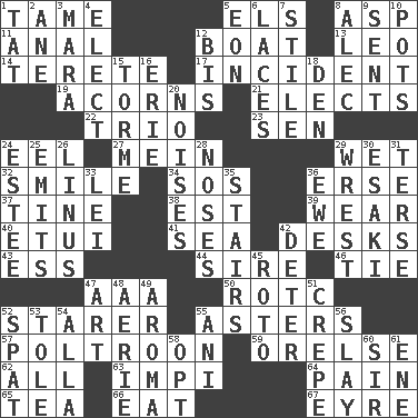ACROSS 1. Docile 5. Raised railways 8. Viper 11. Of or related to the anus 12. Water vessel 13. Lion 14. Cylindrical with tapered ends 17. Happening 19. Oak nuts 21. Chooses 22. Musical group of three 23. Elected rep. 24. Snakelike fish 27. Chow _ 29. Dripping 32. Grin 34. Mayday 36. Celtic language 37. Prong on a fork 38. Eastern Standard Time (abbr.) 39. Put on (as clothing) 40. Needle case 41. Ocean 42. Writing tables 43. Double-curved letter 44. The founder of a family 46. Neckwear 47. American Automobile Association (abbr.) 50. College mil. group 52. A viewer who gazes fixedly 55. Michaelmas daisies 57. Coward 59. Threatening words 62. Everything 63. Body of Kaffir warriors 64. Ache 65. Beverage made from leaves 66. Erode 67. Jane of fiction DOWN 1. Make lace 2. A saturated hydrocarbon 3. Hindu Mythology: god of death 4. Opt 5. A really long time 6. Shoestrings 7. Vertical member of a panel or frame 8. Actor Baldwin 9. Emitted 10. Cooking vessels 12. Again 15. Singer Mel 16. 4th largest of the Great Lakes 18. Lair 20. Annoying sounds 24. First name in cosmetics 25. Sends forth 26. "_ and Lucy" (Charlie Brown theme song) 28. Olfactory organs 29. Obtain by seizing forcibly or violently 30. 1973 Nobel Price Winner (Physics) Leo 31. Laconic 33. Flowery wreath 35. Flight of steps 36. She-sheep 42. Prevent from occurring 45. Printing process, for short 47. Nonscientific branch of learning 48. Nest on high 49. Odor 51. Streamer paper 52. Argument over a trivial matter 53. Lacquered or enameled metalware 54. Silent film actress Nazimova 55. Cuckoo 56. Kill 58. Elect 60. Title for a knight 61. Compass dir.