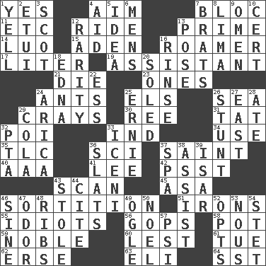 ACROSS 1. Consenting reply 4. Direct toward a target or goal 7. Group of countries in special alliance 11. And so on (abbr.) 12. Travel on an animal 13. First class 14. Nilotic language 15. Arabian gulf 16. Nomad 17. 61 cubic inches 19. Aide 21. Pass on 23. Singles 24. Pismires 25. Raised railways 26. Ocean 29. Trading vessels 30. Portuguese money of account (variant) 31. Make lace 32. Luau course 33. Indiana (abbr.) 34. Purpose 35. Affectionate concern, for short 36. _-fi 37. Inhabitant of Heaven 40. Auto club (abbr.) 41. Area sheltered from the wind 42. Inconspicuous attention getter 43. Examine hastily 45. White ___ sheet 46. Decision 51. Metal shackles 55. Foolish or stupid persons 56. Republicans 58. Plant holder 59. Having high moral qualities 60. For fear that 61. Third day of the wk. 62. Celtic language 63. Biblical high priest 64. Fast jet (abbr.) DOWN 1. Shout 2. Needle case 3. Highlander 4. Assist 5. It may be bright or harebrained 6. Not women's 7. Naughty children 8. Pale green bean 9. Presage 10. Sure thing 12. Noteworthy scarcity 13. Airs 16. Wash lightly 18. Pulitzer Prize-winning author Ferber 20. Having a sole or soles 22. Curvy letter 24. N. Chile seaport 25. Bert's buddy 26. Check the growth or development of 27. Compass direction 28. Had dinner 29. Root beer relative 32. Parent Teacher Assoc. 33. Ancient Celtic tribe of eastern Britain 36. Narrow boards 37. Health resort 38. Aid 39. Austrian river, tributary to the Danube 43. Took without asking 44. Quote 46. Trig term 47. Aroma 48. Teases 49. Stare at amorously 50. Christmas carol 52. Chooses 53. Good sense 54. Proofreading order 57. Air pressure measure (abbr.)