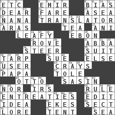 ACROSS 1. And so on (abbr.) 4. Arab leader 8. Prejudice 12. Letter starter 14. Conductor's collection 15. Toward the sea 16. Grandmother 17. Interpreter 20. Caspian sea tributary 21. Beverage made from leaves 22. Cuckoo 23. Like summer trees 27. Inky black, to poets 29. Be footloose 31. Swedish rock group 34. Guide 35. Set or collection 36. Canvas cover 39. Institute legal proceedings 41. Otherwise 42. One who uses or employs something 43. Trading vessels 46. Dad 47. Lacquered or enameled metalware 48. Von Bismarck 51. Indian antelope 54. Not either 56. Big collection agency 58. General guideline 61. Pleas 66. Prepare for publication 67. It may be bright or harebrained 68. Makes supply last 69. Religious group 70. Old wives' tales, e.g. 71. Portable shelter 72. Ocean DOWN 1. Pulitzer Prize-winning author Ferber 2. Pull into pieces 3. Lessep's creation 4. Newt 5. Spoil 6. Lyricist Gershwin 7. Monthly bill 8. Sound made by sheep 9. Byzantium, centuries later 10. Period of immesurable duration 11. Indian skirt 13. To erase 18. Observe 19. Experiment locale 24. Tate display 25. Enemy 26. Jacques Cousteau's middle name 28. Fertile tracts in a desert 30. Spew [out] 32. Twice 33. Had dinner 34. Small fatty European fish 36. Uncastrated adult male sheep 37. White ___ sheet 38. News announcer 40. Greek god of love 44. Insect wing 45. Affirmative reply 49. Make a knot 50. Mouth or opening 52. Angers 53. Unadorned figures 54. Famous astronaut Armstrong 55. Southwest Nigerian state 57. Proofreading order 59. Louse (plural) 60. Singer James 62. Actress Charlotte 63. D.D.E's nickname 64. Car or cant ending 65. Fast jet (abbr.)