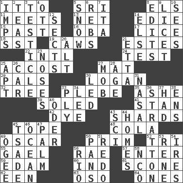 ACROSS 1. "Tell ____ the Marines!" 5. Indian title of respect (Mr.) 8. Raised railways 11. Confronts 13. Fish or hair follower 14. Singer Brickell 15. Thick mixture 16. Chief or king in Benin or Nigeria 17. Louse (plural) 18. Fast jet (abbr.) 19. Crow sounds 21. _____ Park, CO 22. International (abbr.) 24. Trial 25. Buttonhole 27. Floor covering 29. Friends 30. Utah city north of Ogden 32. Family _ (genealogy) 33. Military trainee 35. American tennis player Robert 39. Having a sole or soles 41. Comedian Laurel of Laurel & Hardy 42. Color 43. Pottery fragments 45. Drink excessively 48. Root beer relative 49. Motion picture award 50. Demure 52. Three (prefix) 55. Highlander 56. Actress Charlotte 57. Keyboard key 59. Dutch treat 60. Working for oneself (abbr.) 61. Biscuitlike quick bread 62. Car or cant ending 63. Bear (Spanish) 64. Singles DOWN 1. Naughty children 2. Beverages made from leaves 3. One of the two male reproductive glands 4. Baseball player Mel 5. Frozen precipitation 6. Confederate soldiers (slang) 7. Call ___ day 8. Proofreads 9. It is permitted: Lat. 10. Observes 12. Religious groups 14. Otherwise 20. Keyboard modifier key 21. Singer James 23. Olfactory organs 25. Fitting 26. Auto 27. Disorderly crowd 28. Mature 30. Directed 31. Rhinal 33. Apply oneself diligently 34. Area sheltered from the wind 36. Ski resort town in Vermont 37. Possessed 38. Followers of ems 40. Baltic tributary 43. _-fi 44. Dwellings 45. Sadhe (variant) 46. Sea 47. Inside of hand 49. Double curve, resembling the letter S 50. Baking dishes 51. Make new 53. French philosopher Descartes 54. Angers 56. River (Sp.) 58. Non-commissioned officer (abbr.)
