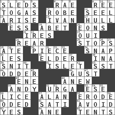ACROSS 1. Bobsleighs 6. Actress Charlotte 9. Portuguese money of account (variant) 12. Ancient Roman robes 13. Loose flowing garment 14. Sew up the eyelids of hawks and falcons 15. Originate 16. "Terrible" tsar 17. Frame or body of a ship 18. Curvy letter 19. Collude with 20. Immeasurably long periods of time 21. Angers 23. Fr. "Yes" 24. Rump 25. Closes up, plugs up 28. Had dinner 30. Component 34. Fastener 35. French article 36. A person who is older than you are 38. _ tizzy (2 wds.) 39. In a ____ (agitated or irritated) 41. Small island 43. Fast jet (abbr.) 44. More peculiar 46. Abrupt rush of wind 48. Compass dir. 49. Afresh 50. Actor Griffith 51. Capital and largest city of Mongolia 53. Compass dir. 56. Louse (plural) 57. Actor Alda or Thicke 58. Wear away 60. Wrote a lyric poem 61. Suttee (variant) 62. Prevent from happening 63. It is so 64. A saturated hydrocarbon 65. Portable shelters DOWN 1. R.R. building 2. Old wives' tales, e.g. 3. Armor plate that protects the chest 4. Hyrax 5. Compass dir. 6. Be footloose 7. Blind as ____ 8. Car or cant ending 9. One who advocates reunion 10. Snakelike fish 11. Pipe bend 13. Chest bones 14. Yells 19. Nest on high 20. Greek goddess of the dawn 22. Strike 24. Dwellings 26. Baking dishes 27. Argument over a trivial matter 28. In addition 29. Be inclined (to) 31. Biblical high priest 32. Music discs 33. Snakelike fish 37. Rain (Swedish) 40. Looked after 42. Third day of the wk. 45. Marina Del _, California 47. Turn aside suddenly 49. Hindu god of fire 50. Assistant 51. ____ Bator 52. Assign a rank or rating to 54. Within a short period 55. Prepare for publication 56. Myrna of the movies 57. White ___ sheet 58. Erode 59. Begley and Asner