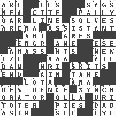 ACROSS 1. Sandy's bark 4. French article 7. Settles 11. Teachers' org. 12. Quote 13. Chummy 14. Rowing implement 15. Actor's bit 16. Finds the solution 17. Sports stadium 19. Helper 21. Cuckoo 23. Ancient Greek god of war 24. Engineer (abbr.) 25. A saturated hydrocarbon 26. Compass dir. 29. Collect or gather 30. Mountains (abbr.) 31. ___ Haven, CT 32. Ending with capital 33. American Automobile Association (abbr.) 34. Had dinner 35. Daniel's nick name 36. Medical imaging device (abbr.) 37. Burlesque acts 40. Conclusion 41. The 18th letter of the Arabic alphabet 42. Not wild 43. Globular water bottle used in Asia 45. Santa ___, CA 46. Home 51. Synchronize (abbr.) 55. Speaker 56. Rounded earthenware pot or jar 58. RI univ. 59. Carrier 60. Sliced desserts 61. June honoree 62. SW Saudi Arabia district 63. Perceive with the eye 64. Sight organ DOWN 1. Small Philippine buffalo 2. Buttocks 3. Conductor's collection 4. Cards in a Roman deck? 5. Inactive volcano in Sicily 6. Perceives with the eye 7. Table seasonings 8. Inventor's middle name 9. Small, secluded valley 10. System (abbr.) 12. Rigngs loudly 13. Introduce or present, as a question 16. Fathers 18. Grandmother 20. Before Barbara or Clara 22. Big collection agency 24. Make improvements or corrections to 25. With great haste 26. Related on the mother's side 27. Arranges properly for use 28. She-sheep 29. Muslim summons to prayer 32. Binary compound 33. Believer in; advocate of (suffix) 36. Mother 37. R.R. building 38. Sunflower state 39. "If ____ say so..." 43. 61 cubic inches 44. Aroma 46. Roll call or roster of names 47. Greek god of love 48. Suttee (variant) 49. 911 reaches them 50. Writer Wiesel 52. Naked 53. Supercomputer manufacturer 54. Flintstone garb 57. Area sheltered from the wind