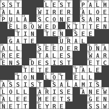 ACROSS 1. Fast jet (abbr.) 4. For fear that 8. Inside of hand 12. Insect wing 13. One who wires 14. _ vera 15. Monetary unit of Botswana 17. Biscuitlike quick bread 18. Indian skirt 19. Turned at an angle; bent 21. Baby cat 23. Metal container 24. "___ Little Indians" 26. Perceive with the eye 27. Yard entry 28. Mountain range 30. Everything 31. Sowing specialist 34. Heredity factor (abbr.) 37. Portuguese money of account (variant) 38. Stories 39. Armed conflict 40. Followers of ems 41. Cease 42. And so on (abbr.) 43. Wig 44. Falsehood 46. Electrically charged atom 47. Car dealer's back yard 50. Pipe bend 51. Aid 54. Deli grouping 57. Hang loosely or laxly 58. Originate 60. Afresh 62. Toward shelter 63. Confronts 64. Commissioned mil. rank 65. Remaining after all deductions 66. Jane of fiction 67. Compass dir. DOWN 1. Plant excrement 2. Turn sharply 3. Baron Munchausen's specialties 4. It is permitted: Lat. 5. Eat (away) 6. Elected rep. 7. Long journey 8. Soft color 9. Having winglike extensions 10. Old wives' tales, e.g. 11. Chow _ 13. Compass dir. 16. "This won't hurt ____!" 20. Single 22. Austrian river, tributary to the Danube 25. Unadorned figures 27. Small, secluded valley 29. Respite 30. "We ___ not amused" (Victoria) 31. Proofreading order 32. Artist's stand 33. Biblical high priest 34. Homes 35. Nathan's nickname 36. Curve 41. Habitations of wild animals 43. Rest room 44. Beverage made from leaves 45. _ mater 46. Small island 48. Flexible twig of a willow tree 49. Clothes sense 51. Actor Alda or Thicke 52. Not divided or shared with others 53. Docile 55. French article 56. Observes 59. Marina Del _, California 61. Compass dir.