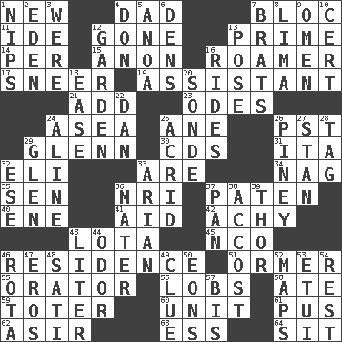ACROSS 1. ___ Haven, CT 4. Male parent 7. Group of countries in special alliance 11. Binary compound 12. Went 13. First class 14. For each 15. Soon (poet.) 16. Nomad 17. Contemptuous expression 19. Helper 21. Say or write further 23. Lyric poems 24. Toward the sea 25. A saturated hydrocarbon 26. Pacific Standard Time (abbr.) 29. American astronaut and politician John 30. Music discs 31. Call ___ day 32. Biblical high priest 33. "We ___ not amused" (Victoria) 34. Tired old horse 35. Elected rep. 36. Medical imaging device (abbr.) 37. Eucharist need 40. Compass dir. 41. Assist 42. Painful 43. Globular water bottle used in Asia 45. Non-commissioned officer (abbr.) 46. Dwelling 51. Channel Islands abalone 55. Speaker 56. Tennis shots 58. Had dinner 59. Carrier 60. A single undivided whole 61. Suppuration 62. SW Saudi Arabia district 63. Double-curved letter 64. Be seated DOWN 1. Pinches, bites 2. Locale of original sin 3. We are 4. Spanish title 5. Small Philippine buffalo 6. Lairs 7. Naughty children 8. Pale green bean 9. Sign of something about to happen 10. An absolute certainty 12. Place where plants grow 13. Airs 16. Amusement-park features 18. Comfort 20. Message 22. Daniel's nick name 24. Place in a line 25. Bitter 26. Abounding in pines 27. Comedian Laurel of Laurel & Hardy 28. Label 29. Small, secluded valley 32. Compass dir. 33. Believer in; advocate of (suffix) 36. Mother 37. Baking dish 38. Buttonhole 39. Son of Odin 43. 61 cubic inches 44. Scent 46. Round or rotation of duties 47. Greek god of love 48. Suttee (variant) 49. A slight indication 50. Immeasurably long periods of time 52. Atlas contents 53. Needle case 54. Take ten 57. Twice