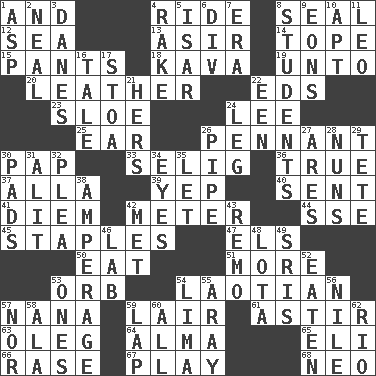 ACROSS 1. Plus 4. Travel on or in a vehicle 8. Lick closed 12. Ocean 13. SW Saudi Arabia district 14. Drink excessively 15. Leg coverings 18. Polynesian shrub of the pepper family 19. To (old English) 20. Cordwainer's material 22. Begley and Asner 23. A type of plum 24. Area sheltered from the wind 25. Ewer handle 26. Pre-World Series prize 30. Infant food 33. Former Milwaukee Brewers owner Bud 36. Loyal 37. Silent film actress Nazimova 39. Slangy assent 40. Transmitted 41. South Vietnam president (1954) 42. Distance measurement 44. Compass dir. 45. Paper fasteners 47. Raised railways 50. Erode 51. Greater amount 53. Globe 54. Of or relating to Laos or its people 57. Grandmother 59. Den 61. Moving or stirring 63. Cassini of fashion 64. _ mater 65. Connecticut Ivy Leaguer 66. To erase 67. Frolic 68. Modern: prefix DOWN 1. Viper 2. Anneal 3. Natives or inhabitants of Denmark 4. Immoral or dissolute person 5. Austrian river, tributary to the Danube 6. HTML Container Element 7. Epoch 8. SAT takers 9. Immeasurably long periods of time 10. Fitting 11. Lion 16. Story 17. Portico 21. Possessive pronoun 22. Car or cant ending 24. Part of a journey 26. Corncob 27. Ancient Greek god of war 28. Religious women 29. Wig 30. Groovy apts. 31. Set down 32. Entreaty 34. Snake ____ (dice throw) 35. Allow 38. Electrical Measurement 42. Was introduced to 43. San ____ (Riviera town) 46. Experiment locale 48. Globular water bottle used in Asia 49. Indian titles of respect 52. Ingested 53. Washington bills 54. Pale green bean 55. Like ___ of sunshine 56. Mediterranean tributary 57. Not either 58. Wing 59. Pet locale 60. 100% 62. River (Sp.)