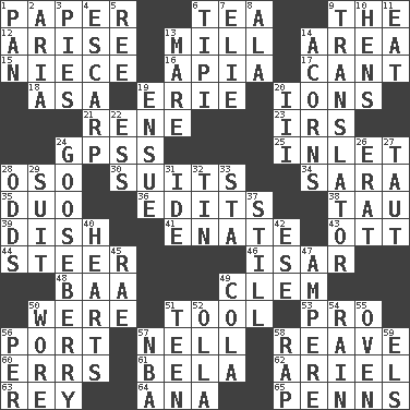 ACROSS 1. Some stationery 6. Beverage made from leaves 9. Definite Article 12. Get up 13. Place where flour is made 14. Type of rug 15. Sibling's daughter 16. Capital of Western Samoa 17. Patter 18. White ___ sheet 19. One of the Great Lakes 20. Charged atoms 21. French philosopher Descartes 23. Big collection agency 24. Global Positioning Systems (abbr.) 25. An arm off of a larger body of water 28. Bear (Spanish) 30. Costumes for special activities 34. "Two Mules for Sister ____" 35. Superhero pair 36. Prepares for publication 38. The 19th letter of the Greek alphabet 39. Food container 41. Related on the mother's side 43. Baseball player Mel 44. Navigate 46. Austrian river, tributary to the Danube 48. Sound made by sheep 49. Clement's nick name 50. Past tense of be (plural) 51. Instrument 53. Adept person 56. Left side of a ship or aircraft 57. 1994 drama film starring Jodie Foster 58. Break or tear apart 60. Blunders 61. Actor Lugosi 62. Satellite of Uranus 63. Marina Del _, California 64. Santa ___, CA 65. Actor Sean's family DOWN 1. Baking dish 2. Operatic vocal solo 3. Sliced desserts 4. Fortification 5. To riddle 6. Native american tent (variation) 7. Writer Wiesel 8. Insect wing 9. Interpreter 10. Coop moms 11. Consume 13. Female horse 14. Oak nuts 19. Take place subsequently 20. One more than two 22. Curvy letter 24. Sour, prickly fruit 26. Part of Q.E.F. 27. Pulled tight 28. Likelihood 29. Costume for a special activity 31. Binary compound 32. Metal container 33. R.R. building 37. Free from disturbance or agitation 40. Centers 42. Compass dir. 45. Actress Charlotte 47. Electrical Unit 49. Root beer relative 50. Had on 51. Adolescent 52. Rounded earthenware pot or jar 54. Water falling in drops from the sky 55. Baking chamber 56. For each 57. Basketball assoc. 58. Strike 59. Raised railways