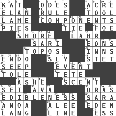 ACROSS 1. Krazy ___ of comics 4. Lyric poems 8. Measure of real estate 12. Liveliness 14. Governing power 15. Utensil 16. Unable to walk 17. Pieces 20. Sliced desserts 21. Standoff 22. Enemy 23. Dinah or Pauly 27. Cowardly lion portrayer 29. Indian skirt 31. Immeasurably long periods of time 34. Traditional theme or motif 35. Restaurants 36. Inside; within (prefix) 39. Stealthy 41. Proofreading order 42. Ooze 43. Incident 46. Lacquered or enameled metalware 47. False hair 48. American tennis player Robert 51. Aroma 54. Arrange properly for use 56. Actress Gardner 58. Mouths or openings 61. The property of being fit to eat 66. "Two Mules for Sister ____" 67. Small Philippine buffalo 68. Toward shelter 69. Paradise 70. Long (Scottish) 71. Actor's bit 72. Curvy letter DOWN 1. Seaweed 2. Jai _ 3. Domesticates 4. The grampus (Milton) 5. Superhero pair 6. Shade tree 7. Back-to-school mo. 8. Had dinner 9. Meet 10. Printing process, for short 11. Otherwise 13. Soft 18. Lubricate 19. Teachers' org. 24. Bear (Spanish) 25. Reproach for some lapse or misdeed 26. Greek god of love 28. Robbery 30. Small island 32. Compass dir. 33. Fast jet (abbr.) 34. Drinks excessively 36. Eastern Standard Time (abbr.) 37. Modern: prefix 38. Conveyance 40. Jacques Cousteau's middle name 44. And so on (abbr.) 45. Born 49. Actor Linden 50. First lady 52. Sense of smell 53. Exchange 54. Lick closed 55. Pulitzer Prize-winning author Ferber 57. Of or related to the anus 59. Ancient Greek god of war 60. Without 62. Container for groceries 63. Connecticut Ivy Leaguer 64. Elected rep. 65. Observe