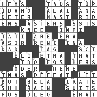 ACROSS 1. Equivocates 5. Small amounts or degrees 9. Uncastrated adult male sheep 12. Potato state 14. Jai _ 15. Santa ___, CA 16. Prevent from occurring 17. Vertical spar for supporting sails 18. To free from 19. Followers of ems 20. Michaelmas daisies 23. Fast planes 24. Leg joint 25. Body of Kaffir warriors 27. Jacques of French films 30. "We ___ not amused" (Victoria) 32. Epoch 33. SW Saudi Arabia district 34. Painter Guido (1575-1642) 36. _ tizzy (2 wds.) 38. Male parent 39. Label 40. _-fi 43. Connecticut Ivy Leaguer 46. Inactive volcano in Sicily 48. Not this but _ 49. Wedding promise 51. Greek goddess of the dawn 52. Possessive pronoun 53. River in Europe 54. French philosopher Descartes 56. It was, poetically 58. Outscore 61. Allow 64. On the contrary 65. Actor Lugosi 66. Feeling or showing extreme anger 68. Quiet! 69. Precipitation 70. Sets or collections 71. Tenth month of the Hindu calendar 72. Margarine 73. Part of Q.E.F. DOWN 1. Flintstone garb 2. Genesis locale 3. Floor coverings 4. A female animal or person 5. Docile 6. Having or resembling wings 7. Small ungulate mammals of Africa 8. Be seated 9. Tarsus (plural) 10. A single undivided whole 11. Groovy apts. 13. Northwest Algerian city 21. Singe 22. Cigar-shaped 23. Connect, as a bridge 24. Apertif with cassis 26. Medical imaging device (abbr.) 27. Small amount or degree 28. White ___ sheet 29. Event that recurs at intervals 31. Maternal 35. Snub 37. American tennis player Robert 41. Automobile 42. It is 44. Flaplike coverings 45. Binary compound 47. At sea 48. Definite Article 50. Severe or trying experience 53. Curses 55. Nuclear Threat Initiatives 56. Cook's measure (abbr.) 57. Chinese city south-southwest of Nanjing 59. Writer Wiesel 60. Papal veil 61. Den 62. Singer James 63. Trial 65. Sis' sibling 67. Regret
