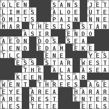 ACROSS 1. Small, secluded valley 5. Without 9. Passenger plane 12. Citrus fruits 14. _ vera 15. Shoshoni 16. Leaves out 17. Ache 18. Compass dir. 19. Third mo. 20. College paper 23. Comedian Laurel of Laurel & Hardy 24. SW Saudi Arabia district 25. Inside; within (prefix) 27. A really long time 30. Two (Sp.) 32. Ocean 33. Grant temporary use of 34. Dutch treat 36. Supplement with great effort 38. Affectionate concern, for short 39. Compass dir. 40. It is so 43. Double-curved letter 46. Play the lead 48. Compass direction 49. Definite Article 51. In the manner of 52. Toward the sea 53. Peachy ____! 54. Austrian river, tributary to the Danube 56. Left 58. Threesomes 61. Mature 64. Sight organ 65. Type of rug 66. Ethiopian city, capital of Harari 68. "We ___ not amused" (Victoria) 69. State of inaction 70. Keyboard key 71. French article 72. Wig 73. Snakelike fish DOWN 1. Take by theft 2. Pale green bean 3. Arab leader 4. Fish or hair follower 5. Plant excrements 6. Jai _ 7. Annoying sounds 8. Elected rep. 9. Secret group 10. Inactive volcano in Sicily 11. Adolescent 13. Fast planes 21. Flintstone garb 22. Eats (away) 23. Neighbor of Neb. 24. Also 26. Born 27. The first octave above the treble staff 28. Snakelike fish 29. Single time 31. Before Barbara or Clara 35. Ear of corn 37. Sight organs 41. Compass dir. 42. R.R. building 44. Proofreading order 45. A female animal or person 47. To erase 48. Armed conflict 50. Main course 53. Leg joints 55. American tennis player Robert 56. Welt 57. Jane of fiction 59. Command 60. Assign a rank or rating to 61. Johnson of "Laugh-In" 62. Highlander 63. Blunders 65. Nonscientific branch of learning 67. A saturated hydrocarbon