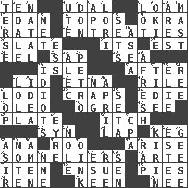 ACROSS 1. Nine, plus one 4. Allodial 8. Rich soil 12. Dutch treat 14. Literary convention 16. Gumbo ingredient 17. Pace 18. Pleas 20. Schedule 22. ___ a Wonderful Life 23. Eastern Standard Time (abbr.) 24. Snakelike fish 25. Plant excrement 28. Ocean 30. Small island 31. Following 35. Hat (slang) 37. Inactive volcano in Sicily 40. Cause heat under the collar 41. Farming town in central California 42. Dice game 44. Singer Brickell 45. Margarine 46. Legendary monster 47. Perceive with the eye 48. Food holder 50. Hankering 52. Symbol (abbr.) 54. Infant locale 55. Cask 58. Santa ___, CA 61. Friend of Pooh 63. Get up 65. Wine waiters 70. Johnson of "Laugh-In" 71. A distinct part 72. Take place subsequently 73. Sliced desserts 74. French philosopher Descartes 75. Peachy ____! 76. Born DOWN 1. Laconic 2. Peak District village in England 3. Brizilian seaport 4. Shoshoni 5. Spanish title 6. Fitting 7. Australian parrot (variant) 8. Car dealer's back yard 9. Migrant worker of the '30s 10. Ancient Greek god of war 11. Vertical spar for supporting sails 13. Was introduced to 15. Arranges properly for use 19. Toward the sea 21. Double-curved letter 26. Actor Baldwin 27. Stone: prefix 29. Anew 30. Foolish or stupid persons 32. Periodic rise and fall of the sea level 33. Writer Wiesel 34. To separate or throw off 35. Hang loosely or laxly 36. The content of cognition 38. Tired old horse 39. Showery time 41. Trim (branches) 43. Stalk of a moss capsule 49. Jane of fiction 51. Tax preparer (abbr.) 53. Undercover agent 55. Japanese brewing company 56. First name in cosmetics 57. Honkers 58. SW Saudi Arabia district 59. Brief written record 60. So be it 62. Pig sound 64. Reproach for some lapse or misdeed 66. Madame (abbr.) 67. Compass dir. 68. Sorrow 69. Elected rep.