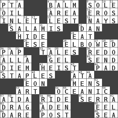 ACROSS 1. Parent Teacher Assoc. 4. Lip ointment 8. Flatfish 12. Lubricate 13. Length times width 14. Greek god of love 15. An arm off of a larger body of water 18. For fear that 19. Negative votes 20. Deli grouping 22. Daniel's nick name 23. Flintstone garb 24. Ingest 25. Compass dir. 26. Turned at an angle; bent 30. Infant food 33. Lies 36. Do over again 37. Silent film actress Nazimova 39. Set 40. Post 41. South Vietnam president (1954) 42. Robbery 44. Writing tablet 45. Paper fasteners 47. "One Day ___ Time" 50. Period of immesurable duration 51. Not women's 53. Tate display 54. Pertaining to the sea 57. Opera by Verdi 59. Travel on or in a vehicle 61. Father Junipero _ 63. To be drawn or hauled along 64. Arabian gulf 65. Snakelike fish 66. Have the gumption 67. Mail 68. Ocean DOWN 1. Luau course 2. Airtight sealed metal containers 3. Assad's deity 4. Indonesian resort city 5. Ancient Greek god of war 6. French article 7. Floor protector 8. Elected representatives 9. Northwest Algerian city 10. Myrna of the movies 11. Double-curved letter 16. Writer Wiesel 17. Bits 21. Rendezvous 22. Apply (a substance) by light strokes 24. Raised railways 26. Snakelike fish 27. Shed a tear 28. Pulitzer Prize-winning author Ferber 29. Texas town _ City 30. Writing tablets 31. Set down 32. Entreaty 34. Ripens 35. Flowery wreath 38. Electrical Measurement 42. Layer 43. Docile 46. Car dealer's back yard 48. Afternoon social gatherings 49. Queen of England 1702-14 52. Male parents of animals 53. The sixth month of the Jewish calendar 54. Lyric poems 55. Penny 56. Algonquian 57. Increase 58. Retirement account (abbr.) 59. Reproach for some lapse or misdeed 60. Wedding promise 62. Insect wing