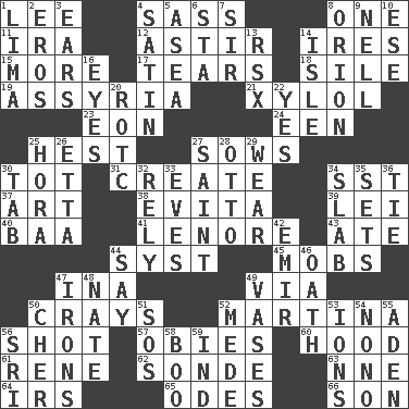 ACROSS 1. Area sheltered from the wind 4. Backtalk 8. Single 11. Retirement account (abbr.) 12. Having gotten out of bed 14. Angers 15. Greater amount 17. Pulls into pieces 18. Drop; flow; fall 19. Nineveh was its capital 21. Xylene (variant) 23. Age 24. Car or cant ending 25. Command 27. Sty mamas 30. Small child 31. Cause to be 34. Fast jet (abbr.) 37. Nonscientific branch of learning 38. Webber/Rice musical 39. Luau accessory 40. Sound made by sheep 41. Poe poem 43. Had dinner 44. System (abbr.) 45. Crowds into 47. _ tizzy (2 wds.) 49. By way of 50. Trading vessels 52. Chrissie's court nemesis 56. Opportunity 57. Off-Broadway awards 60. Parka part 61. French philosopher Descartes 62. Message 63. Compass dir. 64. Big collection agency 65. Lyric poems 66. Boy, to dad DOWN 1. Pale green bean 2. Greek god of love 3. Hearing organs 4. Smooth fabric 5. Toward the sea 6. R.R. building 7. Title for a knight 8. Constellation of myth 9. 1994 drama film starring Jodie Foster 10. Compass dir. 13. Acura sports coupe 14. Small island 16. Snake ____ (dice throw) 20. College mil. group 22. Consenting reply 25. Israeli folk dance 26. Singer James 27. Virtuous person 28. "Beetle Bailey" pooch 29. Erode 30. Keyboard key 32. Depend 33. Nights before holidays 34. Thick slice 35. Arranges properly for use 36. Neckwear 42. Arab leader 44. Declare 46. Pledge 47. Metal shackles 48. Nathan's nickname 49. Flower holders 50. "Mermaids" star 51. Mayday 52. Ancient Persian 53. Charged atoms 54. Words to Nanette 55. Arabian gulf 56. Indian title of respect (Mr.) 58. Oct. 31 cry 59. Indiana (abbr.)