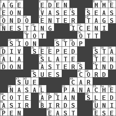 ACROSS 1. Ripen 4. Paradise 8. Madame (abbr.) 11. Period of immesurable duration 12. Flower holders 14. Oceans 15. Southwest Nigerian state 17. Keyboard key 18. Labels 19. Snuggling 21. Ancient Celtic tribe of eastern Britain 23. Small child 24. Baseball player Mel 25. The Jewish people; Israel 27. Halt 30. HTML Container Element 31. Oozed 34. R.R. building 37. In the manner of 38. Schedule 39. Nine, plus one 40. Spanish title 41. Michaelmas daisies 43. Indiana (abbr.) 44. Institutes legal proceedings 45. Drawstring 47. Institute legal proceedings 49. Auto 50. Rhinal 52. Flamboyance 56. ____ d'Azur (French Riviera) 57. Bee-related 60. Downhill vehicle 61. SW Saudi Arabia district 62. Avian creatures 63. Single; one (prefix) 64. Writing instrument 65. 90 degrees 66. Compass dir. DOWN 1. A really long time 2. Went 3. Conclusions 4. Incident 5. Mild oath, euphamism for damn 6. Eastern Standard Time (abbr.) 7. Born 8. Intended 9. Wise men 10. Double-curved letter 13. Indian title of respect (Mr.) 14. Proofreading order 16. "Beetle Bailey" pooch 20. Charged atoms 22. Police officer (slang) 25. Grain storage tower 26. _ the terrible 27. Arguments over trivial matters 28. Wig 29. River in Europe 30. June honoree 32. He sold his birthright 33. Otherwise 34. Tumult 35. Look after 36. Also 42. Examine hastily 44. Ocean 46. Mouths or openings 47. Smooth fabric 48. One who uses or employs something 49. 2nd pers. sing. pres. of can (arch.) 50. Characteristic smell of wine 51. Experiment locale 52. Writing tablets 53. A slight indication 54. Coop moms 55. Singer Brickell 56. Head covering 58. Sliced dessert 59. Lyricist Gershwin