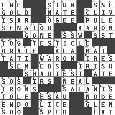 ACROSS 1. Compass dir. 4. Astound 8. Compass dir. 11. Gilt 13. Nathan's nickname 14. 154 in Roman numerals 15. Austrian river, tributary to the Danube 16. Double curve, resembling the letter S 17. Whimper 18. Elected representative 21. Composer Copland 22. Went 23. Compass dir. 25. Fast jet (abbr.) 26. Coat; cloak 29. A testis 32. Declaim 34. Chicken ___ king 35. Floor protector 38. Jacques of French films 39. Make _____ (do battle with) 41. Angers 43. Elected rep. 44. Begley and Asner 45. From or relating to Ireland 46. Most dark, concealed or hidden 50. Had dinner 51. Distress signal 54. Big collection agency 55. Anneal 57. Metal shackles 59. Deli grouping 63. Lacquered or enameled metalware 64. Son of Isaac 67. Connecting point 68. Inside; within (prefix) 69. Louse (plural) 70. Small, secluded valley 71. "Barney Miller" actor Jack 72. Drove too fast 73. Consume DOWN 1. The front part of a cuirass 2. Olfactory organ 3. Enthusiasm 4. Sounds asleep 5. Label 6. Shoshoni 7. Born 8. Plays smoothly or legato 9. Grain storage towers 10. Incident 12. To be drawn or hauled along 14. Numbers guy (abbr.) 19. Carry 20. Single 21. Leather borer 23. Grain storage tower 24. Glance over 26. Small child 27. Mouths or openings 28. Yard entry 30. Tarsus (plural) 31. Arab leader 33. Metal containers 36. Roberta Peters solo 37. Trial 39. Erode 40. Sums up 42. A female animal or person 45. Slanted text style (abbr.) 47. Part of HMS, perhaps 48. Took place subsequently 49. Ocean 51. Settings 52. U. of Maine site 53. Twentieth part of a lira 56. Austrian-born American filmmaker Fritz 58. Modern: prefix 60. Undercover agent 61. The content of cognition 62. Emitted 64. Raised railways 65. Small drink 66. Adept person