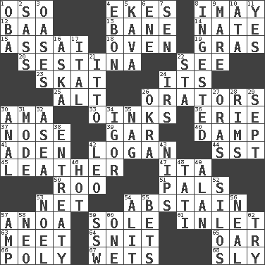 ACROSS 1. Bear (Spanish) 4. Makes supply last 8. "If ____ say so..." 12. Sound made by sheep 13. Object of repulsion 14. Nathan's nickname 15. Slender Brazilian palm 18. Baking chamber 19. Pate de foie ____ 20. French poetic form 22. Observe 23. Three-handed card game 24. It is 25. The first octave above the treble staff 26. Speakers 30. Nursemaid (var.) 33. Pig sounds 36. One of the Great Lakes 37. Olfactory organ 39. Slender fish 40. Moist 41. Arabian gulf 42. Utah city north of Ogden 44. Fast jet (abbr.) 45. Cordwainer's material 47. Call ___ day 50. Friend of Pooh 51. Friends 53. Fish or hair follower 54. Choose not to consume 57. Small Philippine buffalo 59. Flatfish 61. An arm off of a larger body of water 63. Rendezvous 64. In a ____ (agitated or irritated) 65. Rowing implement 66. Much (prefix) 67. Soaks 68. Mischievous DOWN 1. Chief or king in Benin or Nigeria 2. Backtalk 3. Fertile tracts in a desert 4. Inky black, to poets 5. Polynesian shrub of the pepper family 6. Compass dir. 7. Elected rep. 8. Swallowed 9. Female horse 10. "One Day ___ Time" 11. It is so 16. "____ silly question..." 17. Slanted text style (abbr.) 21. "Tell ____ the Marines!" 22. R.R. building 24. Big collection agency 26. Gumbo ingredient 27. Mouths or openings 28. Basketball hoops 29. Back-to-school mo. 30. Of or related to the anus 31. Method 32. At sea 34. Composer Stravinsky 35. Tired old horse 38. Plea 42. Lion 43. Cuts off 46. Being at a high temperature 48. Jacques of French films 49. Actor Alda or Thicke 52. Grain storage towers 53. Christmas carol 54. Came down and settled, as after flight 55. Wagers 56. Be tempered by heat 57. Electrical Unit 58. Modern: prefix 59. Compass dir. 60. Single 62. Attempt to accomplish something