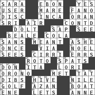 ACROSS 1. "Two Mules for Sister ____" 5. Inky black, to poets 9. It is so 12. One who uses or employs something 13. Female horse 14. Papal veil 15. Flat circle 16. South American Indian 17. NW Algerian seaport 18. Indian title of respect (Mr.) 19. Wind 21. Continued (abbr.) 22. Dunce 24. Plant excrement 26. Observe 27. Memphis, Tenn. Street 28. Root beer relative 29. Without 30. Intended 32. American tennis player Robert 36. At one time in the past 37. By way of 38. Christmas carol 39. Observes 40. High-altitude cloud 42. Blunders 43. Printing process, for short 44. Arguments over trivial matters 46. Spanish title 49. Call ___ day 50. Australian parrot (variant) 51. U. of Maine site 53. Was introduced to 54. Make lace 57. Rights 58. Hub of activity 61. Mediterranean tributary 62. _ course 63. Muslim summons to prayer 64. Water vessel 65. Compass dir. 66. Allows 67. Singer Murray DOWN 1. Beer foam 2. SW Saudi Arabia district 3. Home 4. Curve 5. Independent ruler or chieftain 6. Prohibit 7. The grampus (Milton) 8. Teachers' org. 9. Entertaining tales 10. Maternal 11. Something which is sent 14. Egg _ yung 19. 100% 20. Detail 21. Tax preparer (abbr.) 23. Fertile tracts in a desert 24. Echolocation 25. The first octave above the treble staff 27. Object of repulsion 28. Capital of Egypt 29. Distress signal 31. Webber/Rice musical 32. Approach 33. Determination 34. Possessive pronoun 35. Raised railways 40. Small bed 41. Small island 43. _ de Janeiro 45. Cooking vessel 46. Evade 47. Constellation of myth 48. Impressive in appearance 52. Overdraft (abbr.) 53. Not women's 55. Actor Alda or Thicke 56. False hair 58. Actor Linden 59. Ending with capital 60. Large container 61. Basketball assoc.