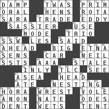 ACROSS 1. Moist 5. It was, poetically 9. Demure 13. Taken by mouth 14. Coop moms 15. Round or rotation of duties 16. "Two Mules for Sister ____" 17. Swap 18. Whirlpool 19. More impudent 21. Purpose 22. Method 23. Musical group of three 24. Compass dir. 27. French article 28. Alleged 29. Forward in time 31. Large 32. Inactive volcano in Sicily 36. Elected reps. 37. Automobile 38. Famous astronaut Armstrong 39. Fast planes 40. Auto club (abbr.) 41. Lacking originality or spontaneity 42. In an inward manner 44. Affectionate concern, for short 46. Observe 47. Toward the sea 48. Froth on beer 50. Had dinner 51. Inhabiting a nest 54. Israeli folk dance 56. Obtain by seizing forcibly or violently 58. Short-tailed, large-bodied rat 60. At once, immediately (arch.) 61. Nathan's nickname 62. Lyric poems 63. Gouge 64. Moistens 65. Portable shelter DOWN 1. Two (Sp.) 2. Ancient river in northeast Turkey 3. Hindu Mythology: god of death 4. Suffix with ecto or cyto 5. Threesomes 6. Erode 7. Also 8. Compass dir. 9. Elected leader of a country 10. Cowboy competition 11. It would 12. Fifth month 17. Event that recurs at intervals 20. Exchanged or delivered for money 21. RI univ. 23. Label 24. Backtalk 25. "______ My Girl" (Turtles hit) 26. Gone 28. Title for a knight 30. Aide 31. Sound made by sheep 33. Afternoon social gatherings 34. "Death on the ____" 35. Toward shelter 37. Island 40. In the manner of 41. Scram! 43. Born 44. College papers 45. For fear that 47. Composer Copland 49. A piece of turf (Scot.) 51. Remaining after all deductions 52. Thickened enlargement 53. Small, secluded valley 54. Possessed 55. Single 56. Compass dir. 57. Actress Charlotte 59. Eastern Standard Time (abbr.)