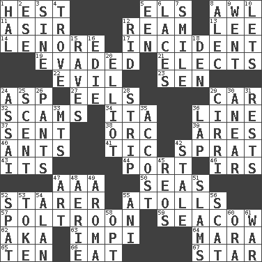 ACROSS 1. Behest 5. Raised railways 8. Leather borer 11. SW Saudi Arabia district 12. 480, 500 or 516 sheets of paper 13. Area sheltered from the wind 14. Poe poem 17. Happening 19. Dodged 21. Opts 22. Morally bad or wrong 23. Elected rep. 24. Cleo's killer 27. Snakelike fish 29. 4-wheeled motor vehicle 32. Fraudulent business schemes 34. Call ___ day 36. Actor's bit 37. Posted 38. The grampus (Milton) 39. Ancient Greek god of war 40. Pismires 41. Nervous spasm 42. Small fatty European fish 43. ___ a Wonderful Life 44. Sweet dark-red dessert wine 46. Big collection agency 47. Auto club (abbr.) 50. Oceans 52. A viewer who gazes fixedly 55. Ringlike coral islands and reefs 57. Characterized by complete cowardliness 59. Manatee 62. Alias (abbr.) 63. Body of Kaffir warriors 64. Hindu Mythology: god of death 65. "___ Little Indians" 66. Consume 67. Play the lead DOWN 1. Actor Linden 2. Compass dir. 3. Trig term 4. Collection of objects 5. Car or cant ending 6. Shoestrings 7. Grin 8. Actor Baldwin 9. Gone 10. Allows 12. To free from 15. All-night dance parties 16. Singer Brickell 18. Lair 20. American author Paul (1891-1958) 24. Slender Brazilian palm 25. Odor 26. Leg coverings 28. Empty completely 29. High-altitude cloud 30. Approach 31. Musical pauses 33. Mountains (abbr.) 35. Buttonhole 36. Pet locale 42. Lacking originality or spontaneity 45. Vintage cars 47. Nonscientific branch of learning 48. Nest on high 49. Scent 51. Criticizes harshly 52. Argument over a trivial matter 53. Puff or smoke 54. Actor Alda or Thicke 55. Cuckoo 56. Leave at once 58. Choose 60. Mouth or opening 61. Armed conflict
