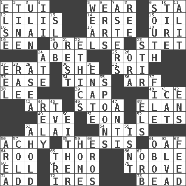 ACROSS 1. Needle holder 5. Put on (as clothing) 9. R.R. building 12. Ms. Damita and namesakes 14. Celtic language 15. Lubricate 16. Slow-paced one 17. Johnson of "Laugh-In" 18. RI univ. 19. Car or cant ending 20. Threatening words 23. Proofreading order 24. Collude with 25. Writer of Portnoy's Complaint (1969) 27. Part of Q.E.F. 30. A female animal or person 32. _ Lanka 33. Relaxation 34. Canisters 36. Sandy's bark 38. Area sheltered from the wind 39. Head covering 40. Frozen water 43. Nonscientific branch of learning 46. Portico 48. Enthusiasm 49. First lady 51. Period of immesurable duration 52. Allows 53. Jai _ 54. Nuclear Threat Initiatives 56. Painful 58. College paper 61. Clumsy lout 64. Friend of Pooh 65. Son of Odin 66. Having high moral qualities 68. Pipe bend 69. San ____ (Riviera town) 70. Collection of objects 71. Find the sum of 72. Angers 73. Necklace unit DOWN 1. Otherwise 2. Prong on a fork 3. ____ Bator 4. One more than two 5. Welt 6. Blunders 7. Michaelmas daisies 8. Portuguese money of account (variant) 9. Compass direction 10. Become fatigued 11. Came down and settled, as after flight 13. Messy guy 21. Relief 22. Principles of right and wrong 23. Tumult 24. Had dinner 26. Mouth or opening 27. Snakelike fish 28. Actress Charlotte 29. Toward the sea 31. Related on the mother's side 35. Soup utensils 37. Do some clerical work 41. Domesticated feline 42. Followers of ems 44. Have trust in 45. Federal power corp. 47. Opposed to 48. Raised railways 50. One or the other of two 53. Hold, grip (Informal) 55. Is not 56. Type of rug 57. Having a low temperature 59. Residence 60. Greek god of love 61. Mitch Miller's instrument 62. Inventor's middle name 63. Nourish 65. Three (prefix) 67. Globe