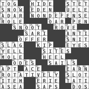 ACROSS 1. Coat; cloak 4. Flintstone garb 8. Proofreading order 12. Overwhelm 14. Locale of original sin 15. Ubangi River tributary 16. The sixth month of the Jewish calendar 17. Unrelated to defense, as in spending 20. Hero or heavy, e.g. 21. Rowing implement 22. Writing instrument 23. Snob 27. Be footloose 29. Indian skirt 31. Opposed to 34. Auction bid 35. In a ____ (agitated or irritated) 36. Volcanic refuse 39. Sleep 41. Snake ____ (dice throw) 42. Shout 43. Locates 46. Undercover agent 47. The bottom of a shoe or boot 48. Lyric poems 51. Moves on water 54. Fitting 56. Adept person 58. Merit 61. Producing rotation 66. Groove 67. A distinct part 68. 4th largest of the Great Lakes 69. Jacques of French films 70. At sea 71. Plant excrements 72. Two (Sp.) DOWN 1. Russian ruler of old 2. Southwest Nigerian state 3. Finish lines 4. Layer 5. Wedding promise 6. Lair 7. Inside; within (prefix) 8. Take to court 9. 3-inch nail 10. Otherwise 11. Adolescent 13. Songbird 18. Ewer handle 19. From 24. Order of Saint Francis (abbr.) 25. Clumsy lout 26. Long journey 28. Flower holders 30. From or relating to Ireland 32. Make a knot 33. It is 34. Stared 36. Symbol (abbr.) 37. Lion 38. One to whom something is allotted 40. Sliced desserts 44. Beverage made from leaves 45. Connecticut Ivy Leaguer 49. Erode 50. _-fi 52. For fear that 53. Vegetable dish 54. Roberta Peters solo 55. Cooking vessels 57. Nights before holidays 59. Printing process, for short 60. Nuclear Threat Initiatives 62. Nanny (var.) 63. Period 64. Mouth edge 65. Affirmative reply