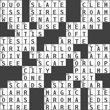 ACROSS 1. Superhero pair 4. Schedule 9. To starve (Brit.) 13. Curvy letter 14. Begets 15. Wander 16. Soggy 17. Maternal 18. Comfort 19. To sift 21. Purpose 22. Intended 24. Nuclear Threat Initiatives 26. Often (poetically) 27. Trials 29. Johnson of "Laugh-In" 30. Believer in; advocate of (suffix) 31. _ and Stitch 33. Scottish cap 36. HTML Container Element 37. Rending 40. "One Day ___ Time" 41. Observe 42. Leave at once 43. Fourth or lowest deck 45. Municipality 47. Insides of hands 48. Single 49. Inconspicuous attention getter 50. Large numbers or amounts 52. Title for a knight 54. Hearing organ 56. Cowardly lion portrayer 57. Mysterious quality of enchantment 59. Whopper 61. Mouths or openings 62. Scent 63. Begley and Asner 64. Become fatigued 65. Less widely known 66. Put into a specified state DOWN 1. Morning condensation 2. One who uses or employs something 3. Clearly or manifestly demonstrative 4. Compass dir. 5. "_ and Lucy" (Charlie Brown theme song) 6. Ancient river in northeast Turkey 7. Wig 8. Compass dir. 9. Make 10. Grant temporary use of 11. 90 degrees 12. Madame (abbr.) 20. Singer James 22. Person of subnormal intelligence 23. Bank Draft (abbr.) 25. Is not 27. Small boys 28. One of the Great Lakes 29. Came down and settled, as after flight 31. Made of lace 32. Retirement account (abbr.) 33. Baron Munchausen's specialties 34. Tiny particle 35. Atlas contents 38. _____ Park, CO 39. Republicans 44. Raze (variant) 45. Unrefined 46. Working for oneself (abbr.) 49. First class 50. Indian skirt 51. Burn to charcoal 52. "Two Mules for Sister ____" 53. Composer Stravinsky 55. Travel on or in a vehicle 56. Car dealer's back yard 57. Impair 58. Automobile 60. Eastern Standard Time (abbr.)