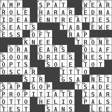ACROSS 1. Electrical Unit 4. Argument over a trivial matter 8. Erode 12. Hero or heavy, e.g. 14. Ethiopian city, capital of Harari 16. Pulitzer Prize-winning author Ferber 17. The main thing one is thinking about 18. Pleas 20. Theater features 22. Keyboard key 23. She-sheep 24. Double-curved letter 25. Often (poetically) 28. Reproach for some lapse or misdeed 30. Leg joint 31. Heavy duty weighing machine 35. Mouth or opening 37. Hearing organs 40. Norwegian king 41. Within a short period 42. Frees from moisture 44. Egg locale 45. Elects 46. Flatfish 47. Small child 48. Motion picture award 50. "Tell ____ the Marines!" 52. Title for a knight 54. Girls' org. (abbr.) 55. Fish or hair follower 58. Plant excrement 61. Republican Party 63. Sadhe (variant) 65. Conciliate 70. Austrian river, tributary to the Danube 71. Von Bismarck 72. Sun: prefix 73. Friends 74. Trial 75. Without 76. Area sheltered from the wind DOWN 1. Ascend 2. Methods 3. Entreaties 4. A female animal or person 5. Baking dish 6. Nonscientific branch of learning 7. Small pie 8. Soggy 9. Singer Brickell 10. Afresh 11. To erase 13. Ingest 15. Tail end 19. Blind as ____ 21. Male child 26. Nourish 27. Lacerates 29. Right away 30. Sunflower state 32. Margarine 33. Political cartoonist Thomas 34. Bank Draft (abbr.) 35. I made a mistake 36. College mil. group 38. River (Sp.) 39. Former Milwaukee Brewers owner Bud 41. "Barney Miller" actor Jack 43. Arranges properly for use 49. Swiss mountan, "Queen of the Mountains" 51. Make lace 53. Writer of Portnoy's Complaint (1969) 55. Relating to the nose 56. Peak District village in England 57. Laconic 58. Specific locale 59. Johnson of "Laugh-In" 60. Plant holders 62. Sliced desserts 64. Small drink 66. Cooking vessel 67. According to 68. Metal container 69. Greek goddess of the dawn